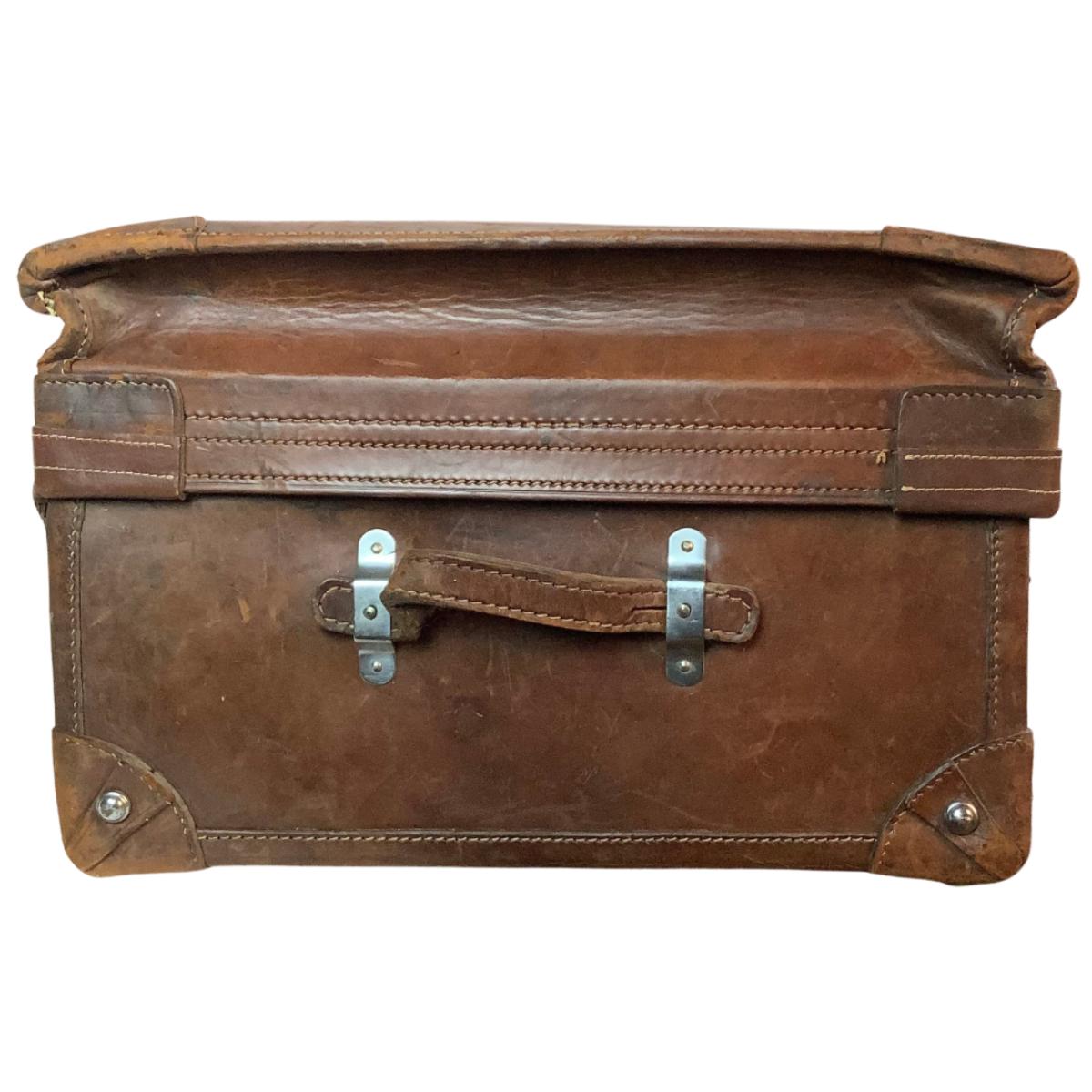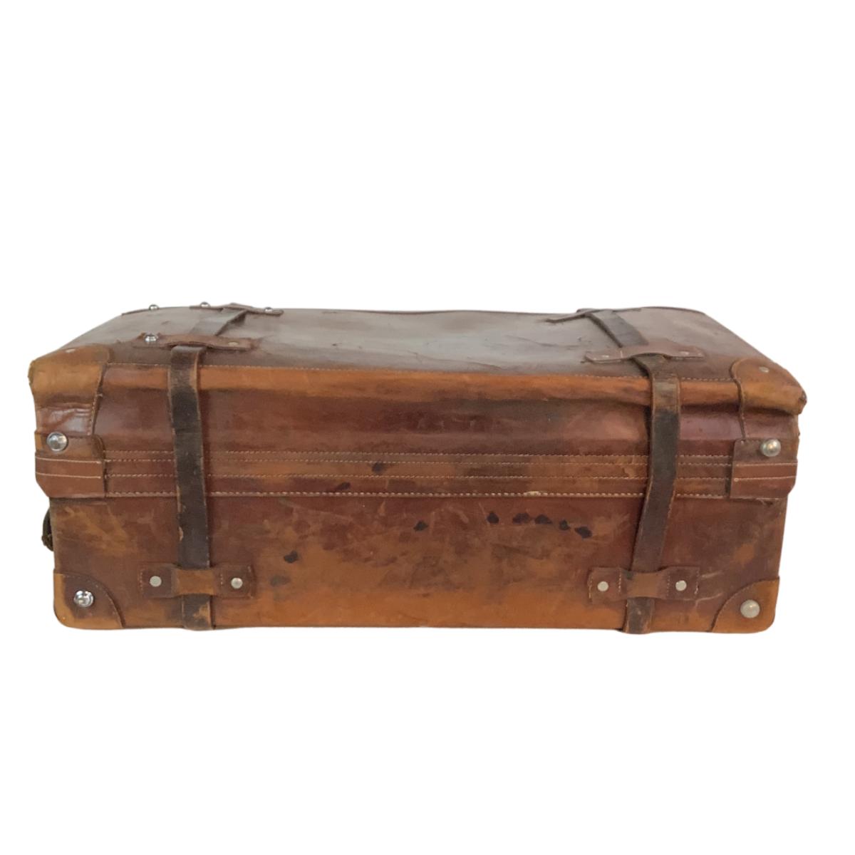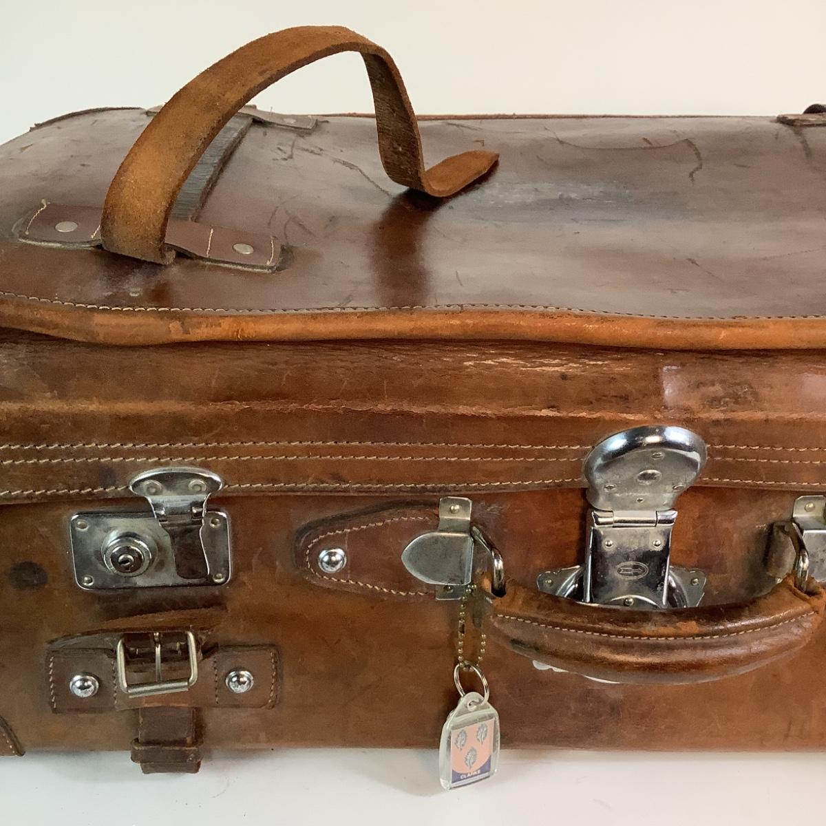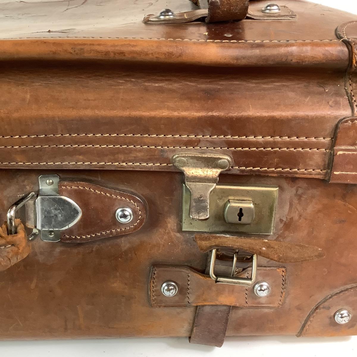 Reinforced exposed straps, handles, chrome latches, includes working key, original pale blue textile interior, one ripped strapped everything else leather is intact. Rich dark leather patina. 30" wide x 11.5" high x 17" deep.