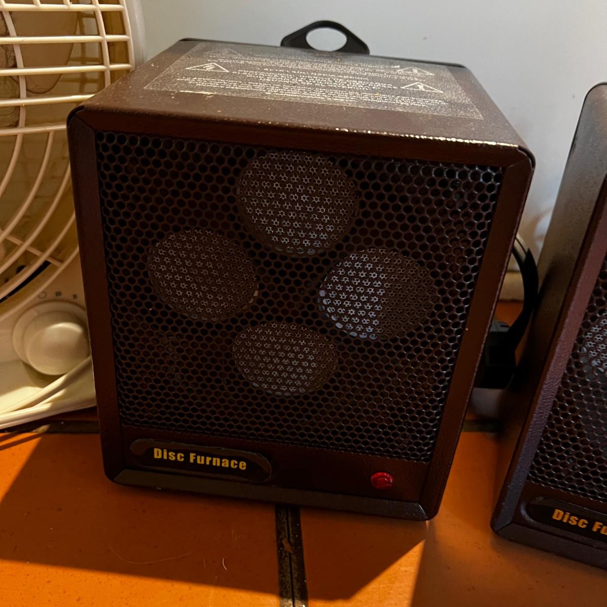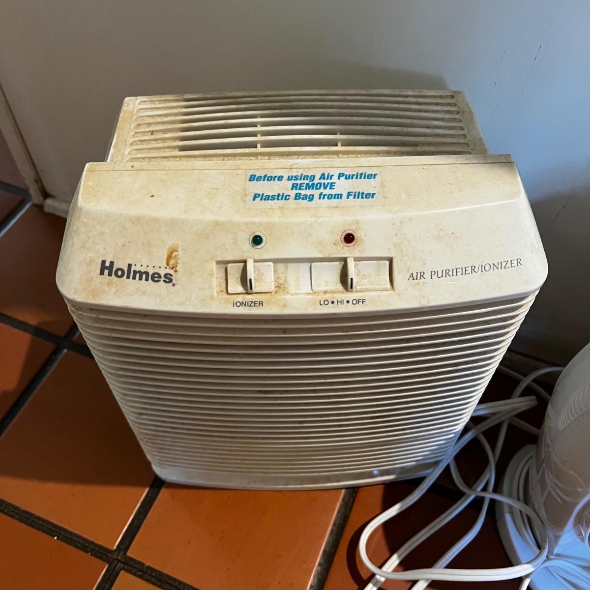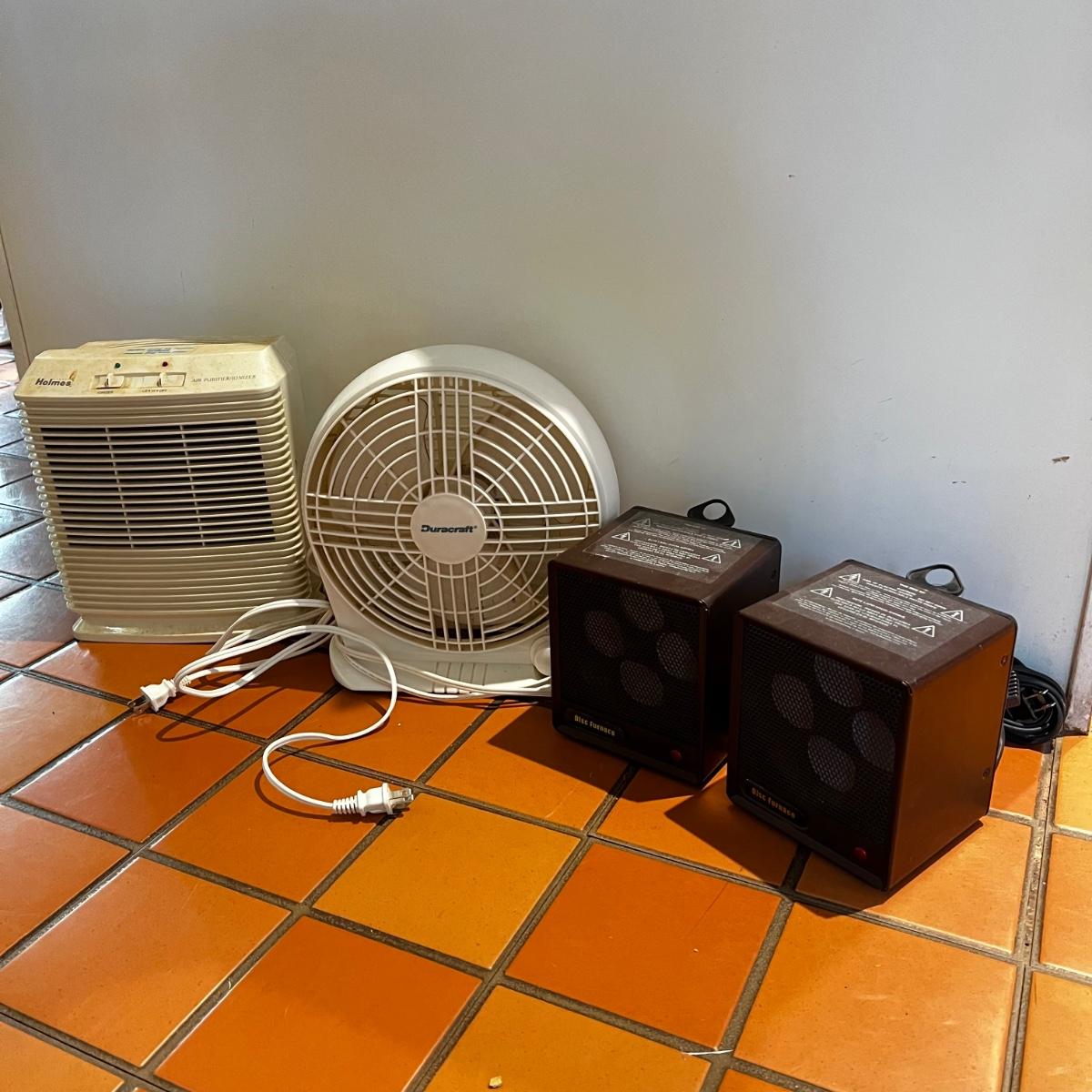 Holmes air purifier, Duracraft fan and 2 disc heaters.