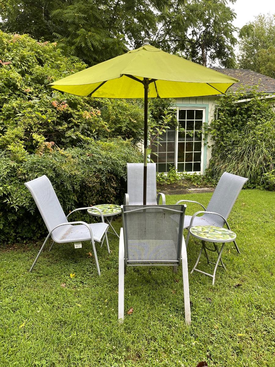 Four Patio Chairs/ 2 Small Folding Tables / Umbrella with Stand