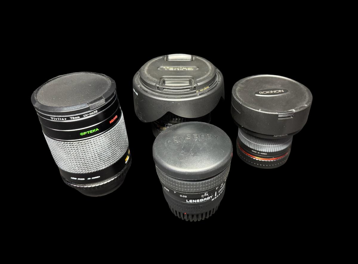 Includes a Rokinon 8mm, a Tokino SD 11-20F, a Lensbaby circular fisheye, and an Optaka HD/MC mirror. Total of four pieces. Not tested. [JL]