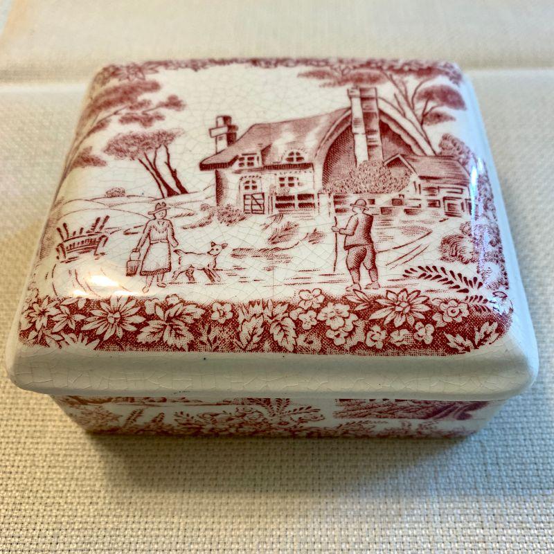 #36 ANTIQUE PORCELAIN BOX ENGLISH RED & WHITE TRANSFER WARE "RUSTIC ENGLAND"