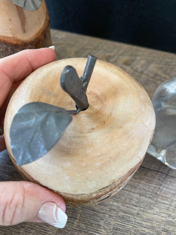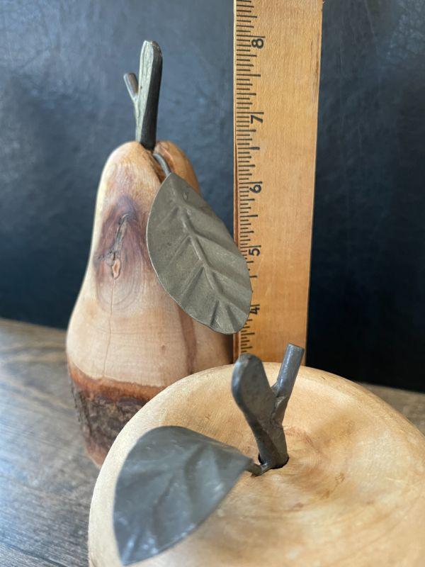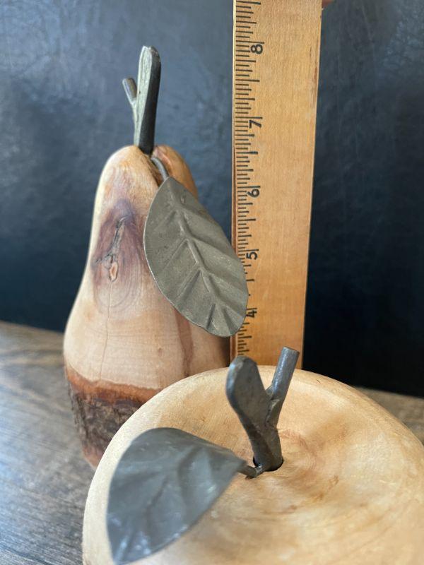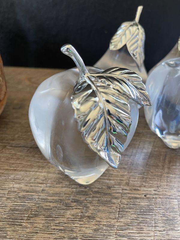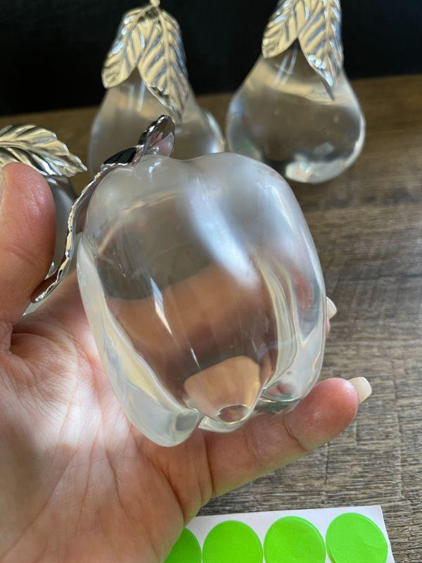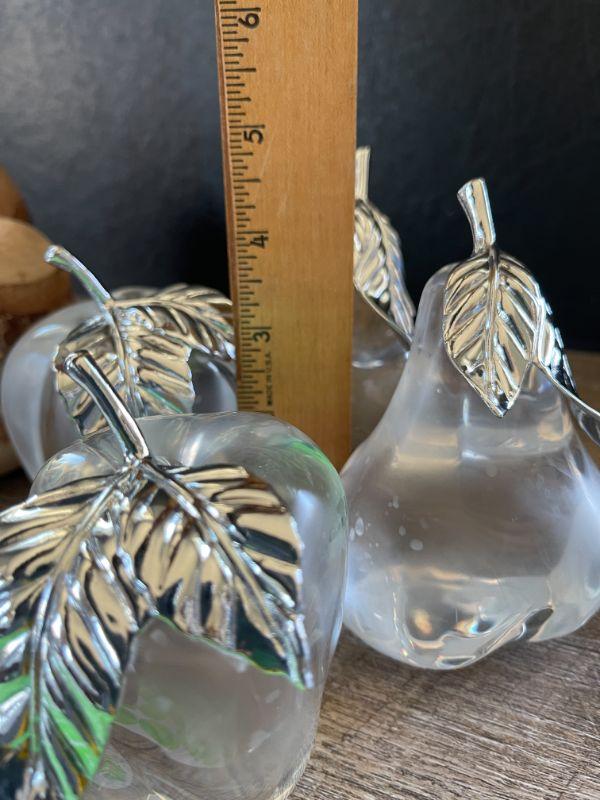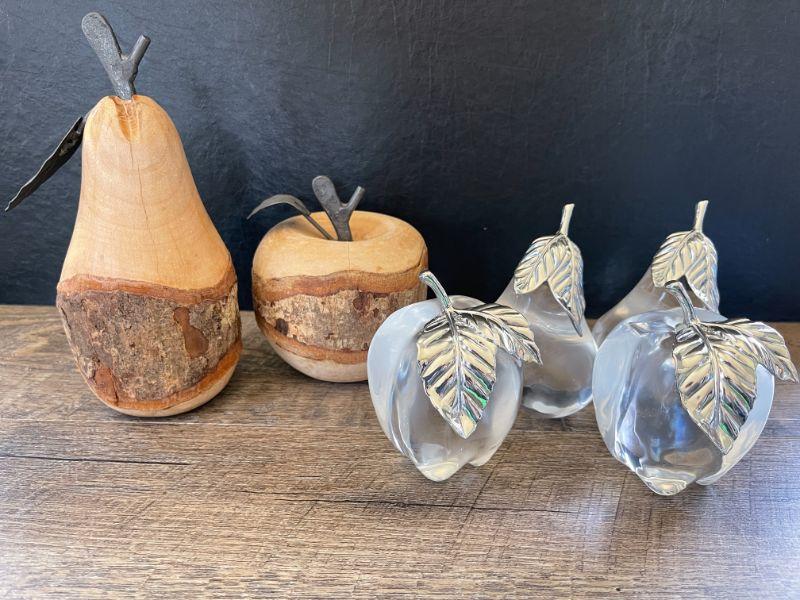Wooden apple and pear with metal stems, and clear Lucite apples and pears with metal stems.