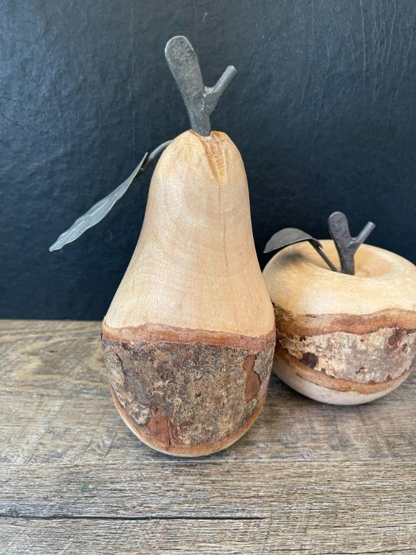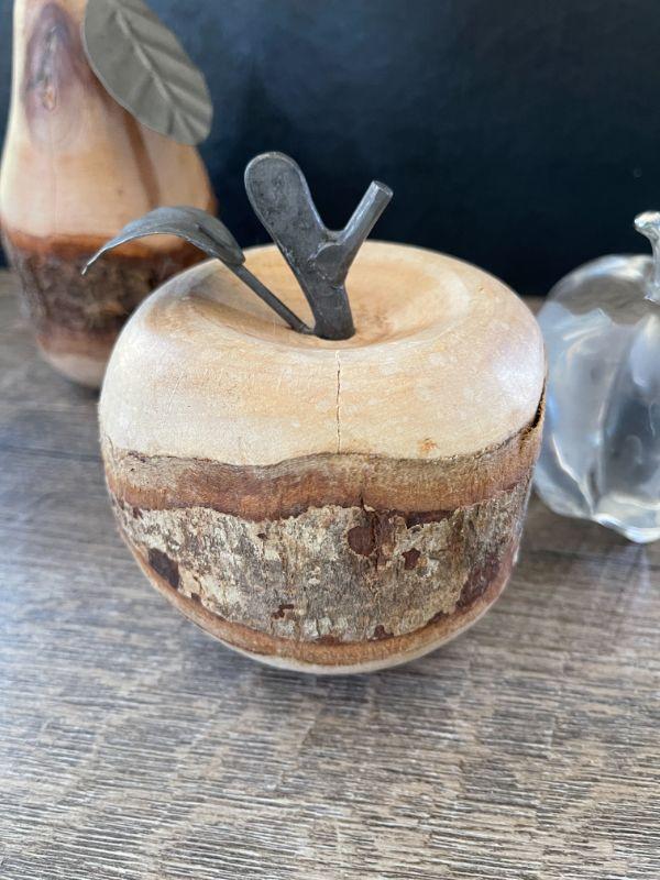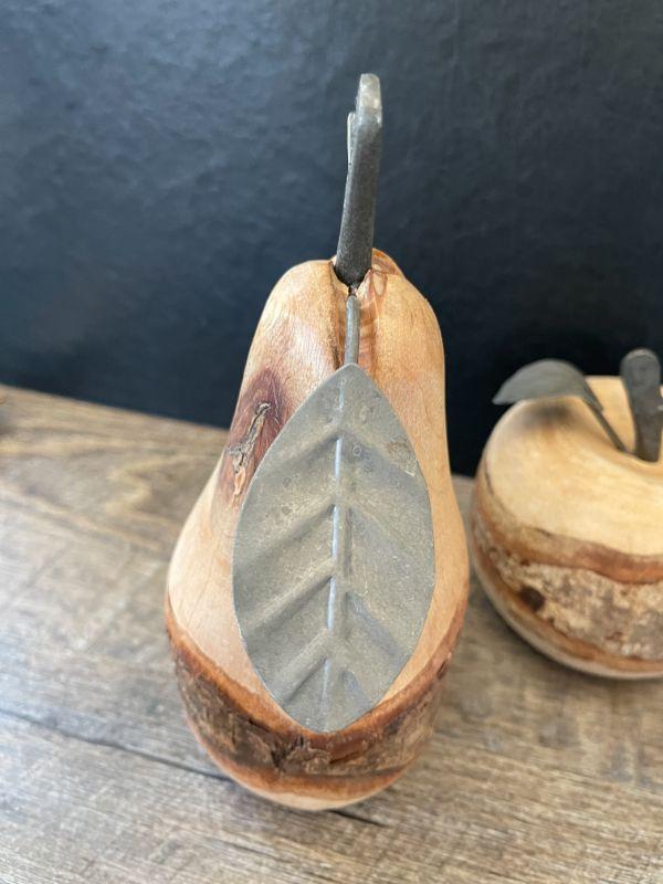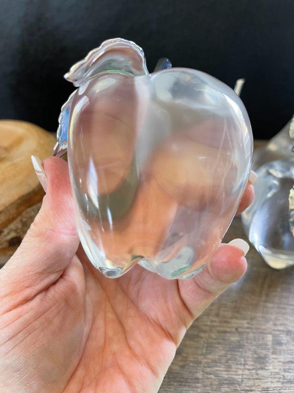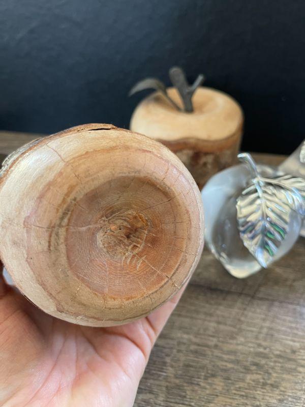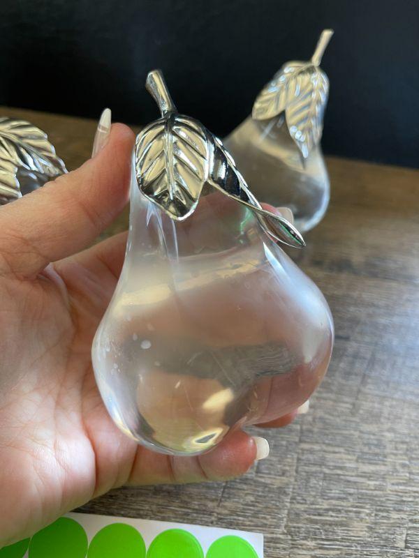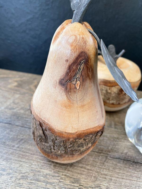 Wooden apple and pear with metal stems, and clear Lucite apples and pears with metal stems.