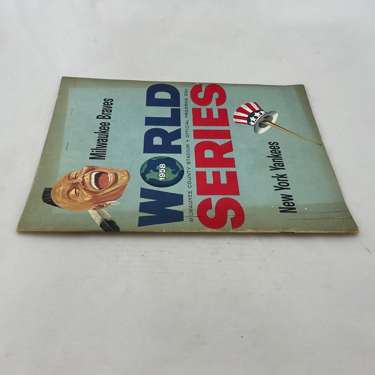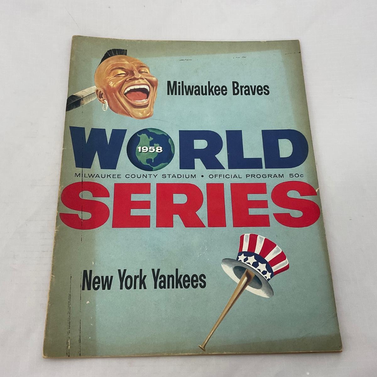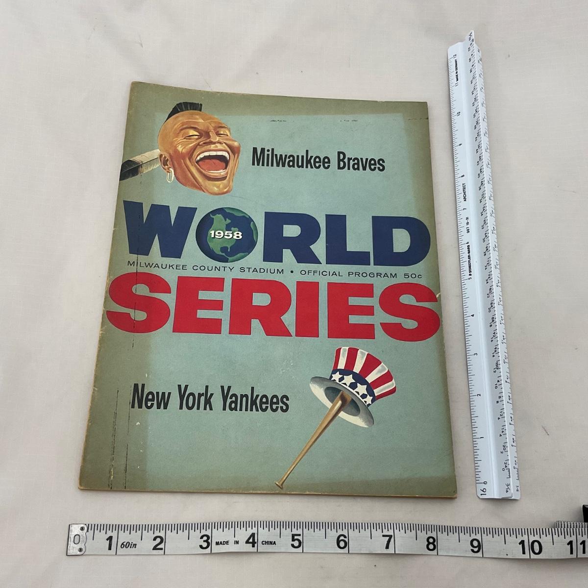 One 1958 World Series program Yankees Vs Milwaukee Braves. Please see photos for details and condition. ::: Shipping is available on this lot. If you require shipping you must let us know at the close of the auction. We will coordinate with you after the item has been won. Shipping fees will include insurance up to or exceeding the value of all items being mailed. If you have any questions regarding this lot please contact the auctioneer either via this website, by direct email or by phone. PICK UP TIMES and other important information can be found in the TERMS and DESCRIPTION of the auction. Please take a look for pertinent information. Thanks!