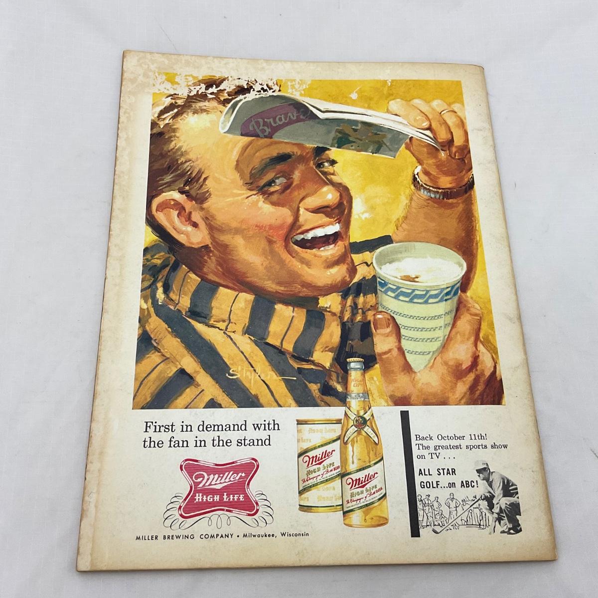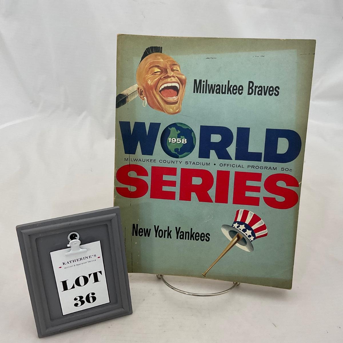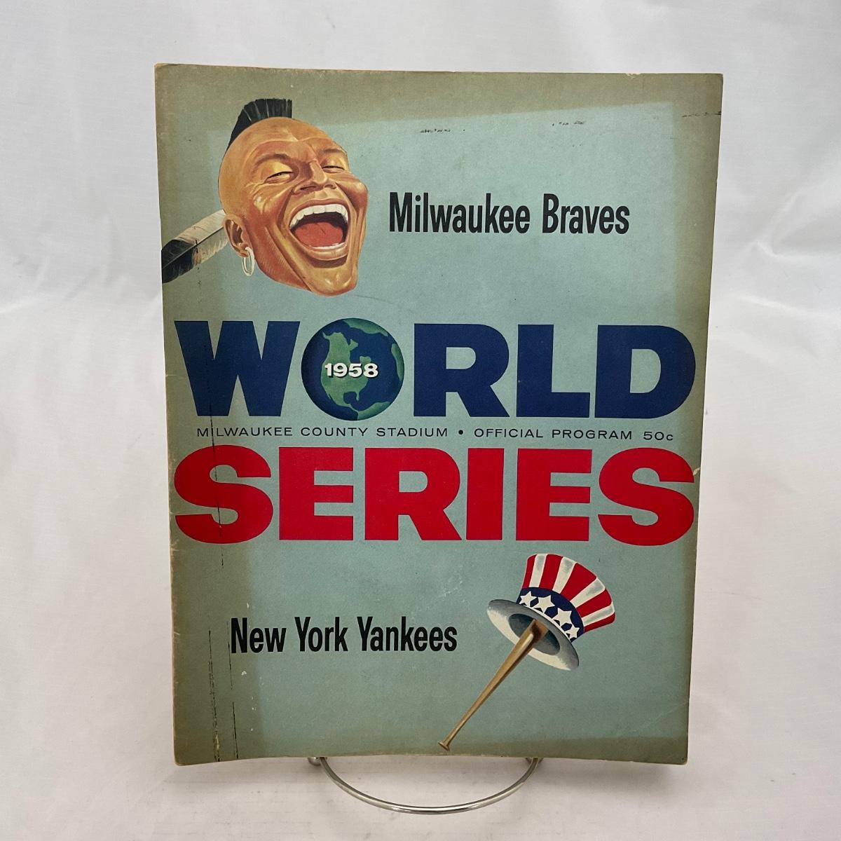 One 1958 World Series program Yankees Vs Milwaukee Braves. Please see photos for details and condition. ::: Shipping is available on this lot. If you require shipping you must let us know at the close of the auction. We will coordinate with you after the item has been won. Shipping fees will include insurance up to or exceeding the value of all items being mailed. If you have any questions regarding this lot please contact the auctioneer either via this website, by direct email or by phone. PICK UP TIMES and other important information can be found in the TERMS and DESCRIPTION of the auction. Please take a look for pertinent information. Thanks!