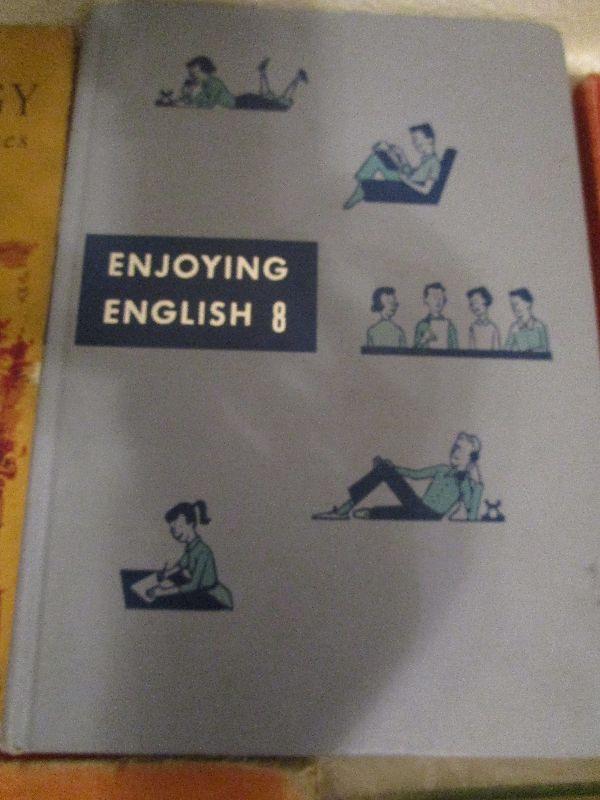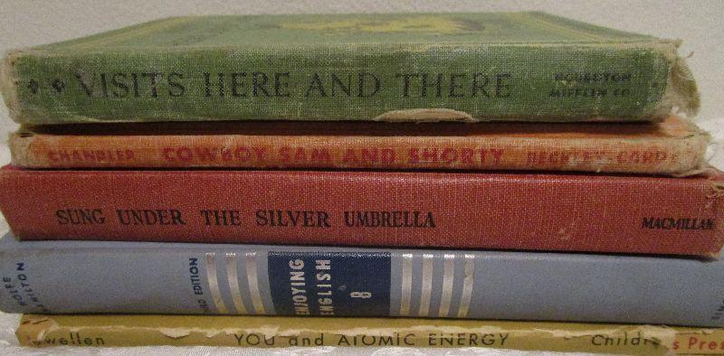 Visits Here and There Child Development Readers, 1935; Cowboy Sam and Shorty, 1953, title page ripped; Sung under the Silver Umbrella, 1935; Enjoying English 8, 1958, Good condition; You and Atomich Energy and its wonderful uses, 1949, Good condition, dust jack not so good condition