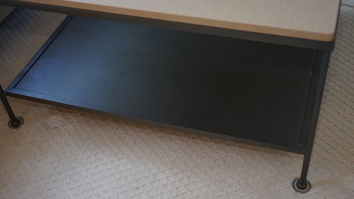 the table has a dark brown colored wrought metal base and note the convenient lower metal shelf.