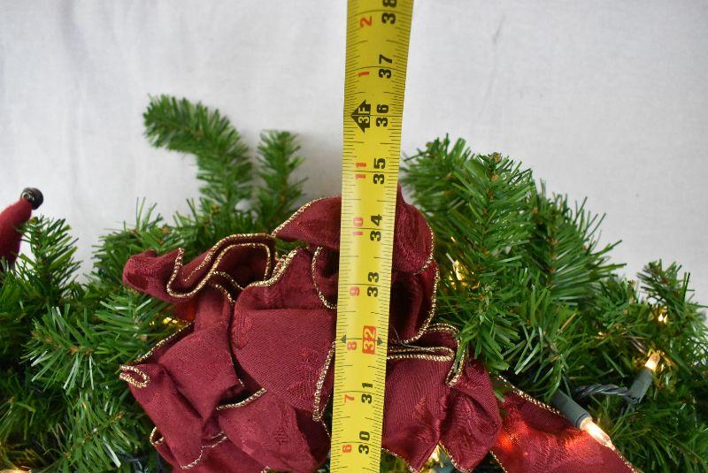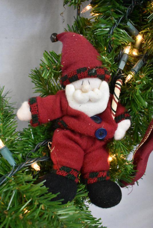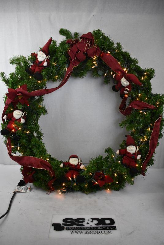 36" Light Up Wreath. Green with Maroon Ribbon & 5 Santas