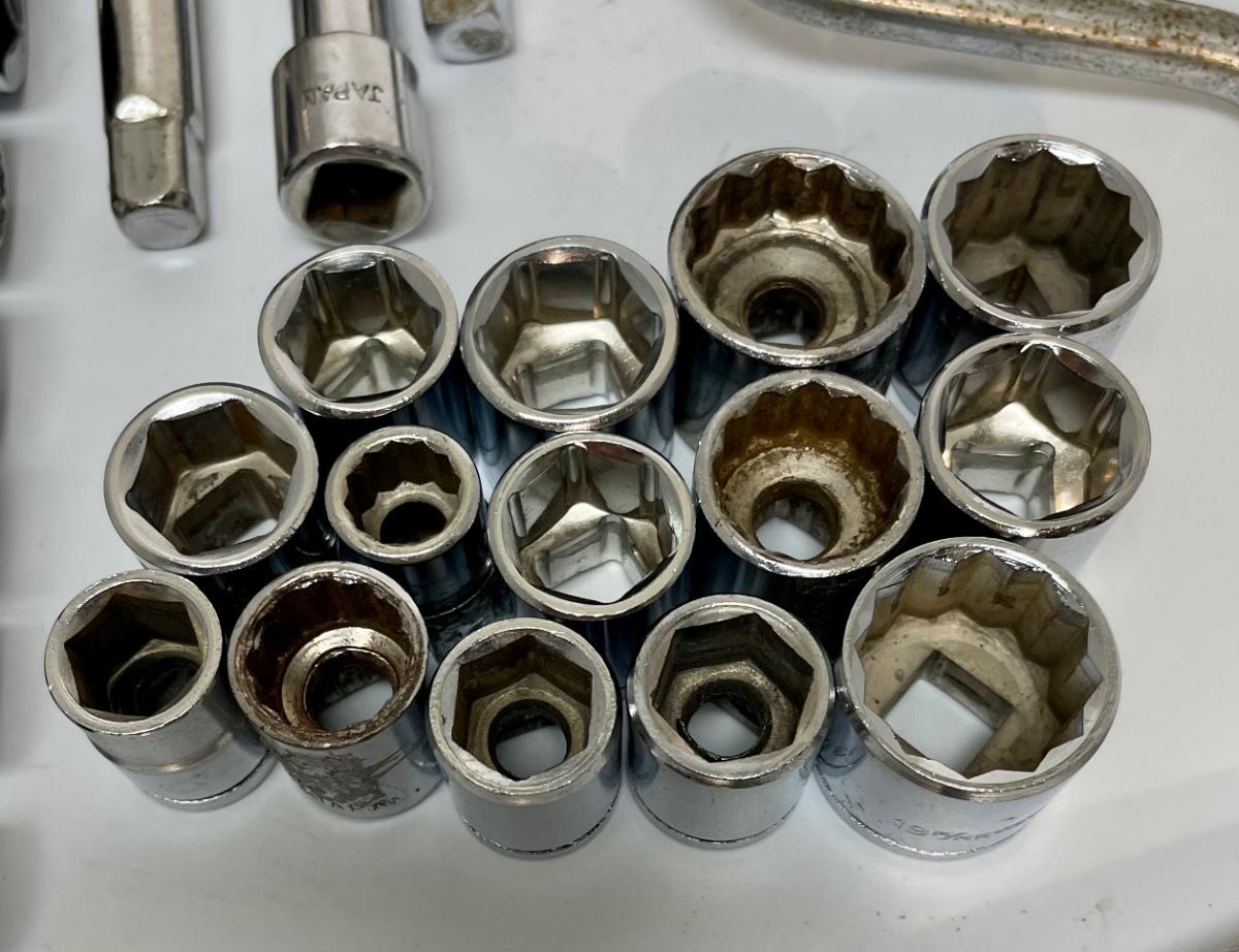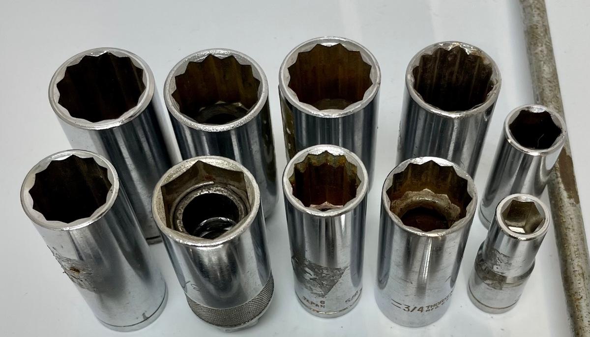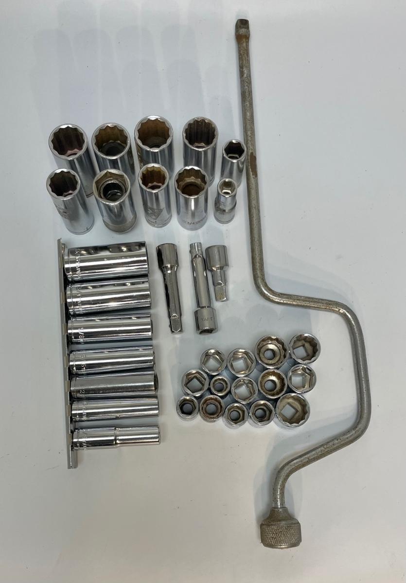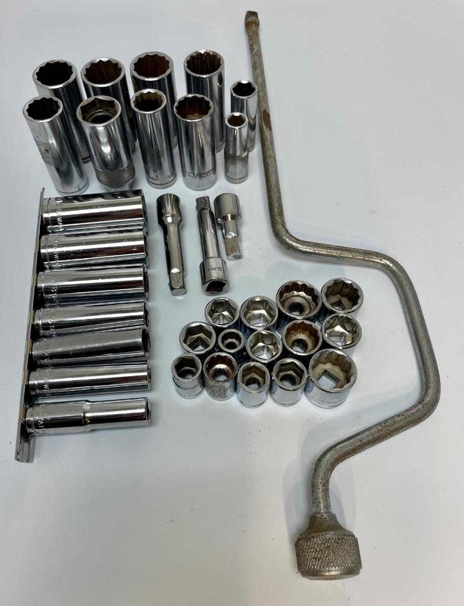 Assortment of 3/8” drive sockets and extensions. Sizes range from 3/8” up to 13/16”. Also includes a 16” speed handle.