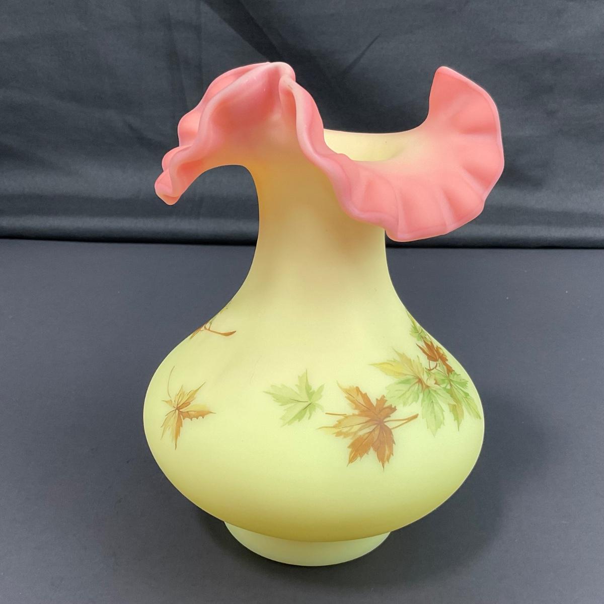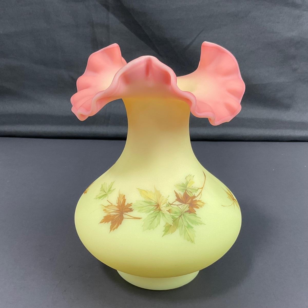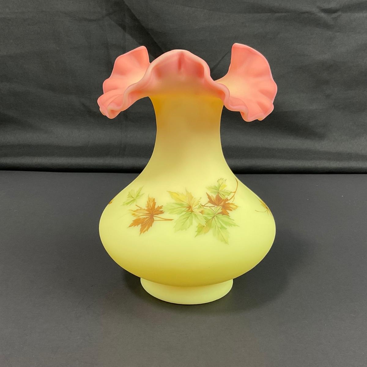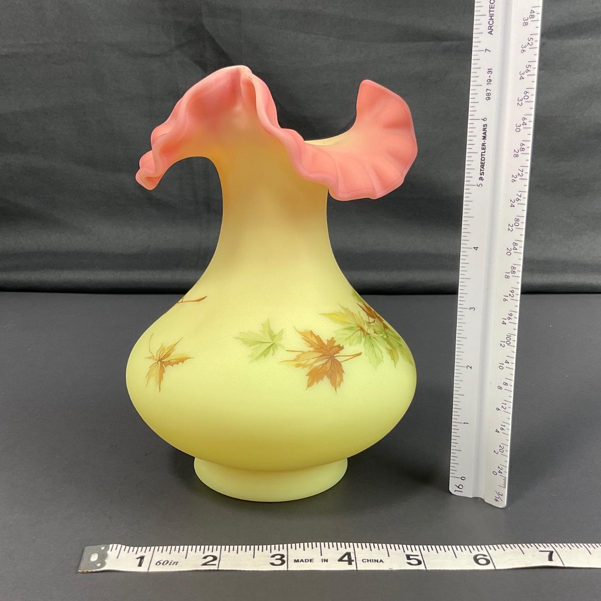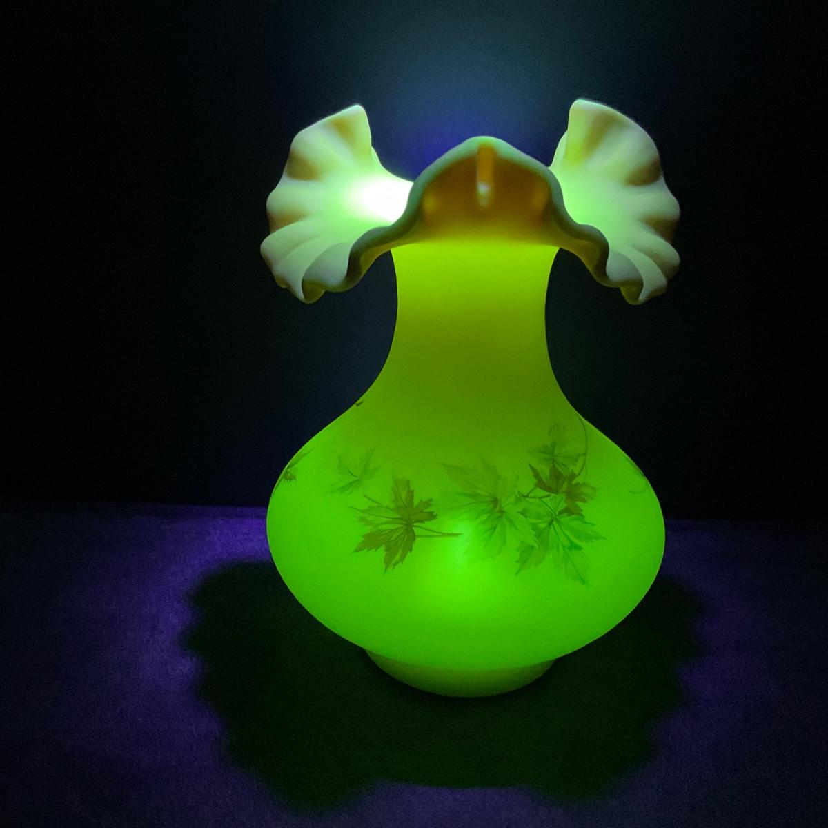-36- URANIUM | Fenton Burmese Leaf Decorated Ruffled Edge Vase