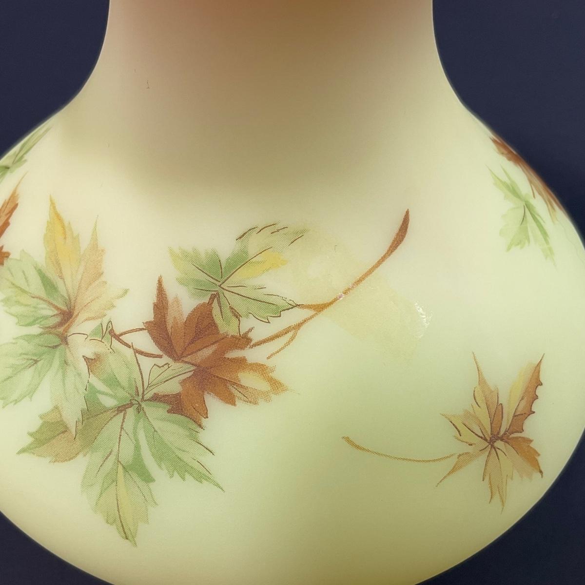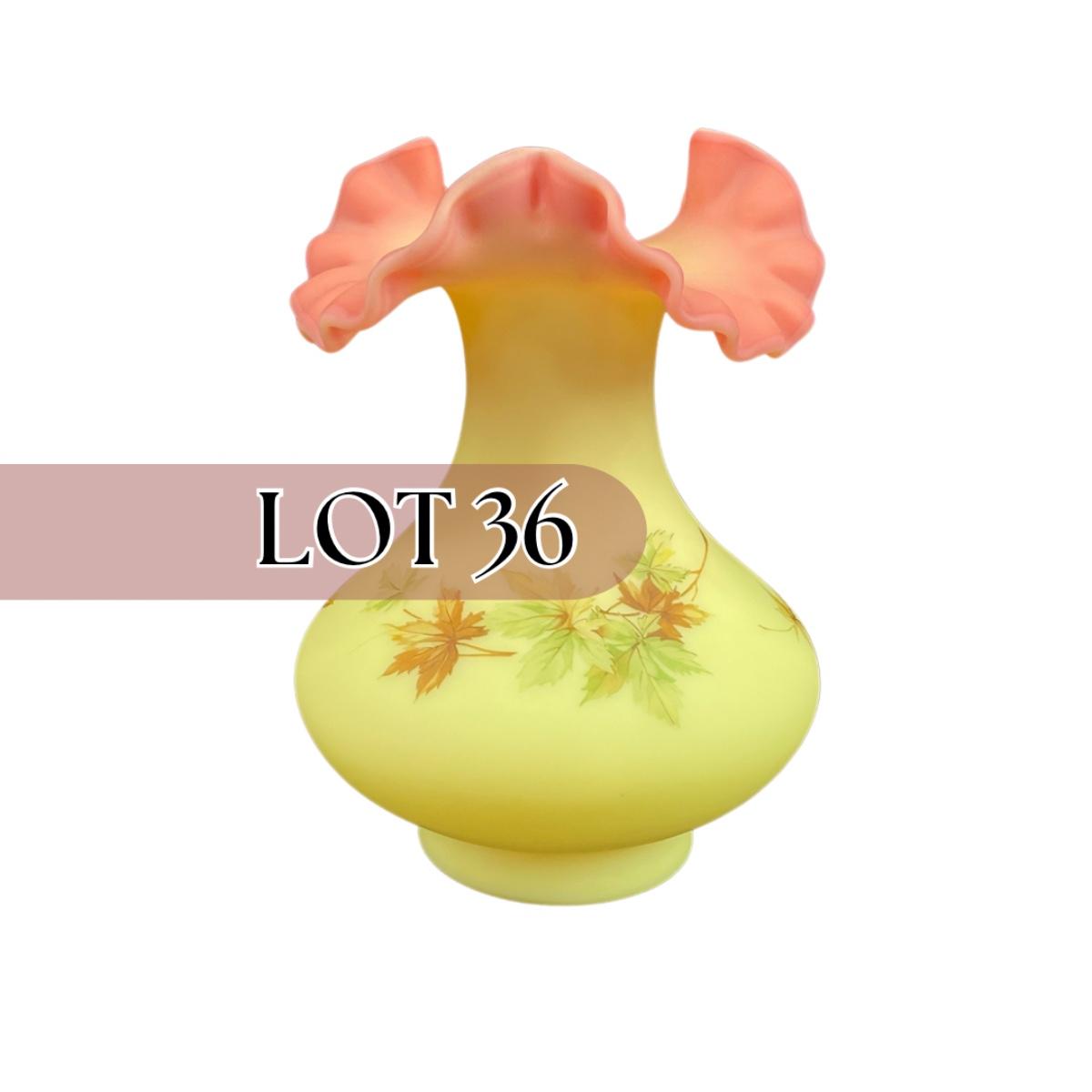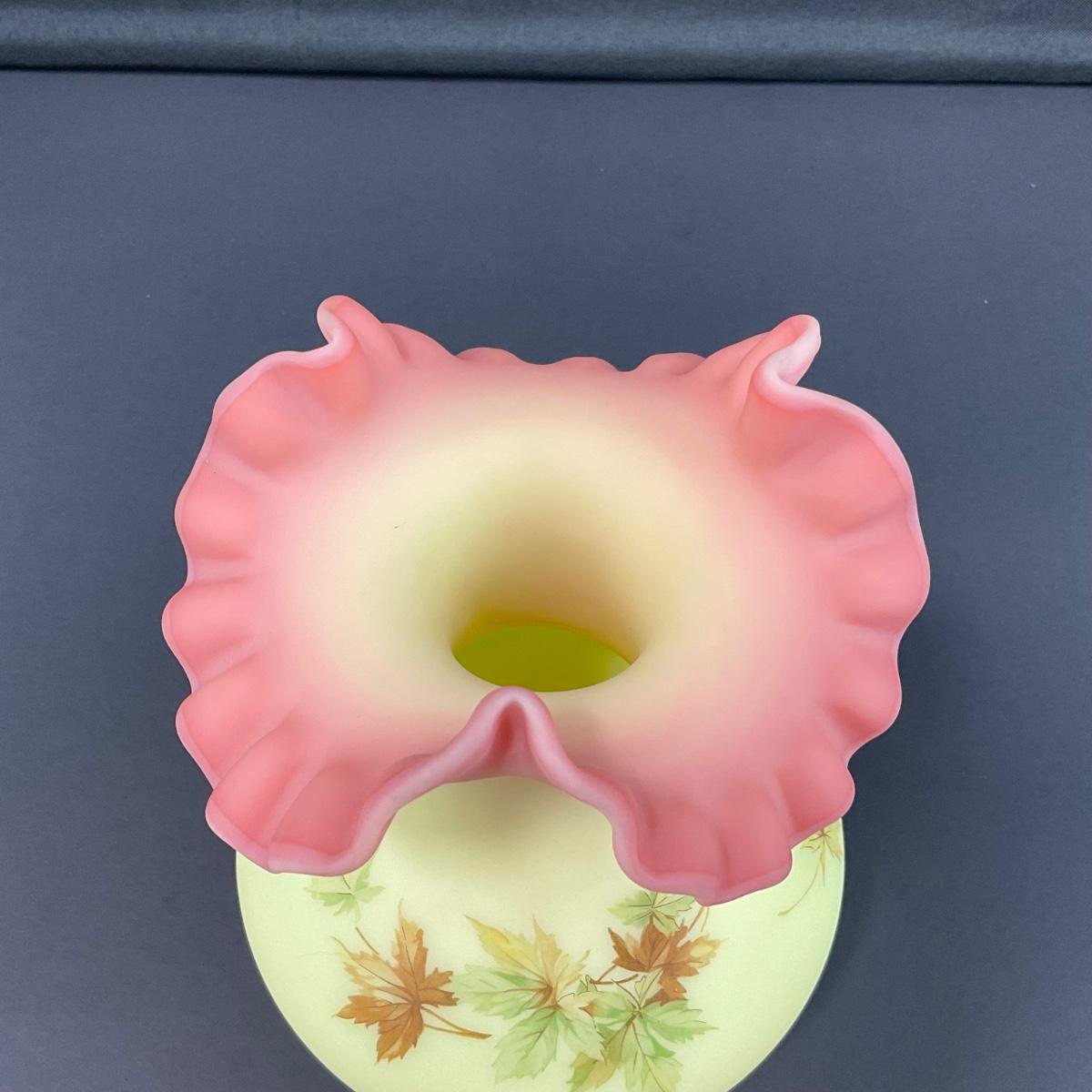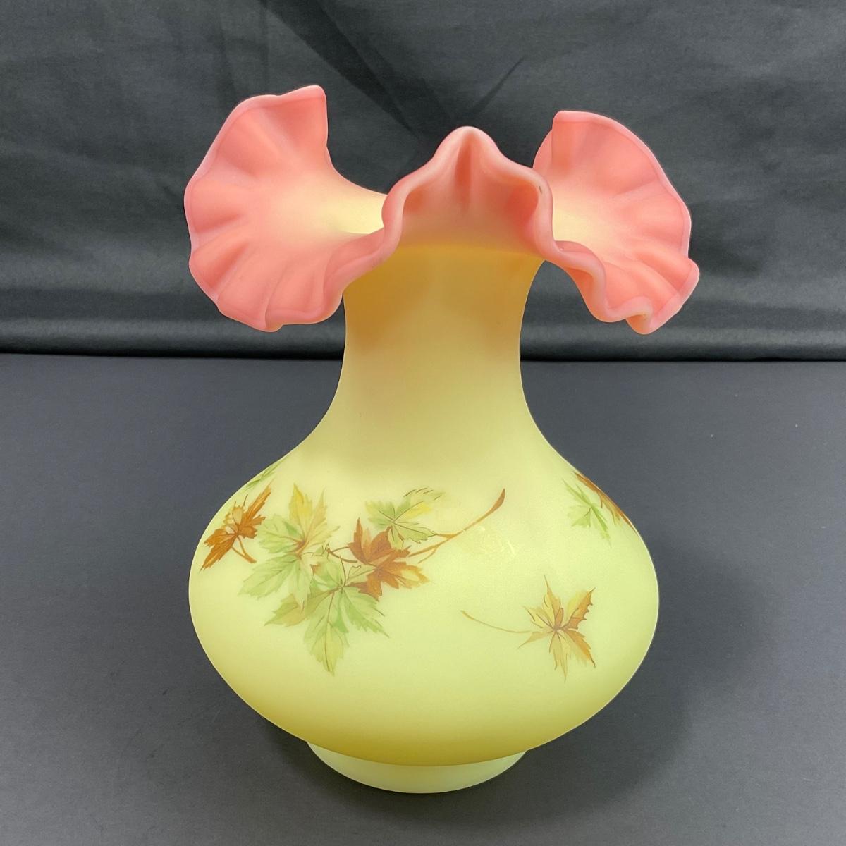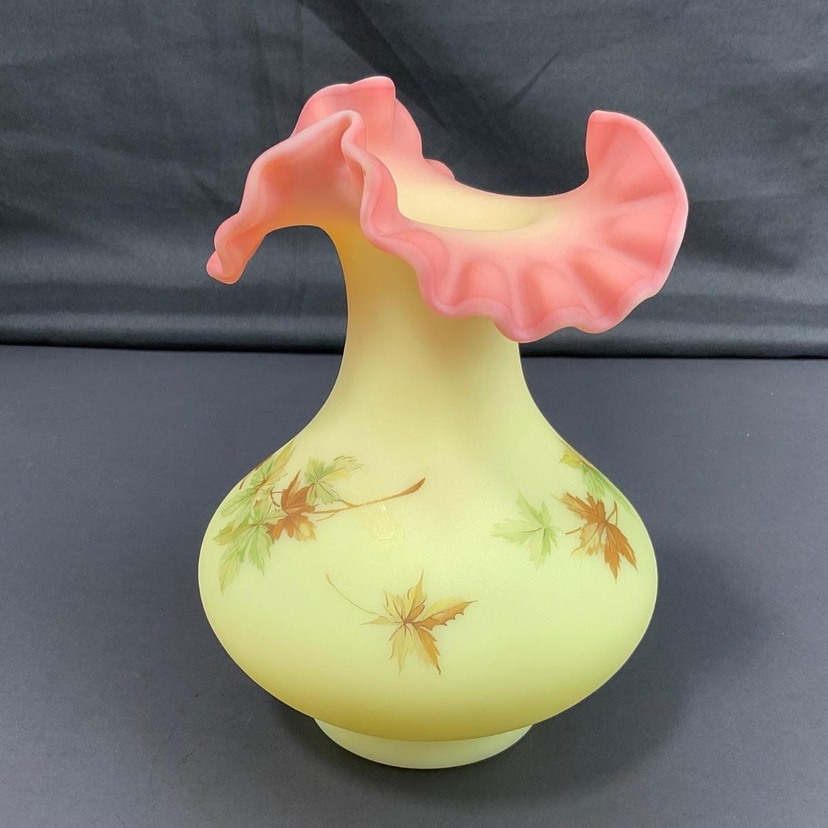 -36- URANIUM | Fenton Burmese Leaf Decorated Ruffled Edge Vase