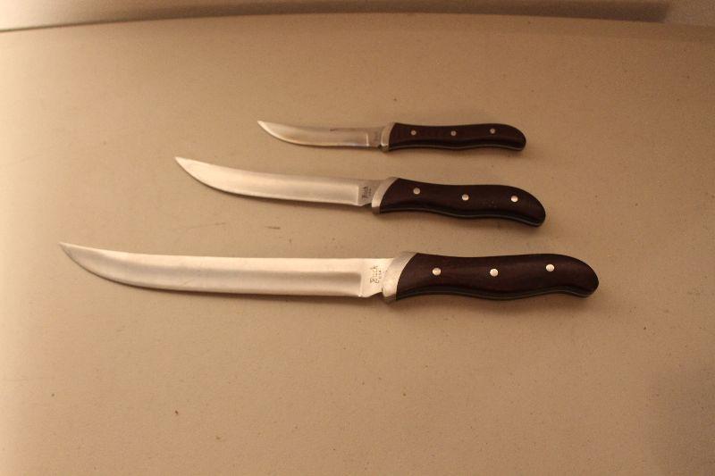 Vintage Buck Set 3 Kitchen Butcher Brand USA Knives Set Carving Wood Handles