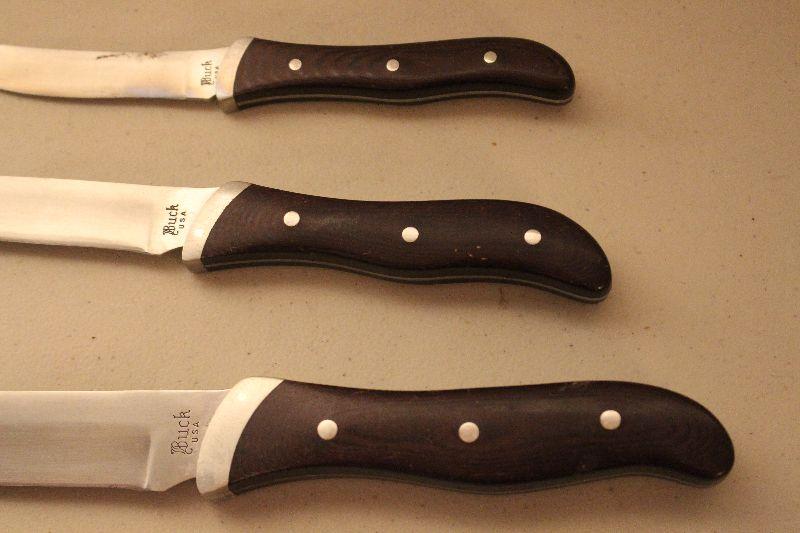 #36 Vintage Buck Set 3 Kitchen Butcher Brand USA Knives Set Carving Wood Handles