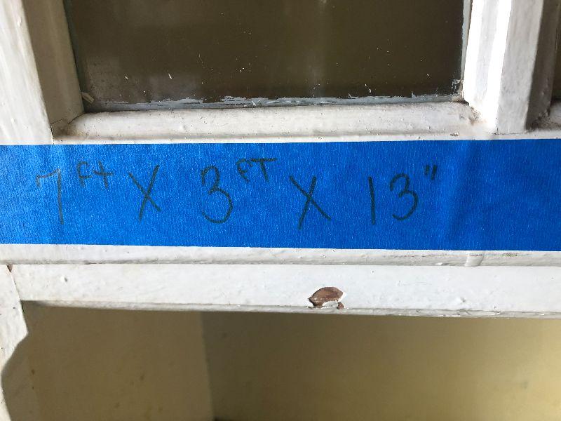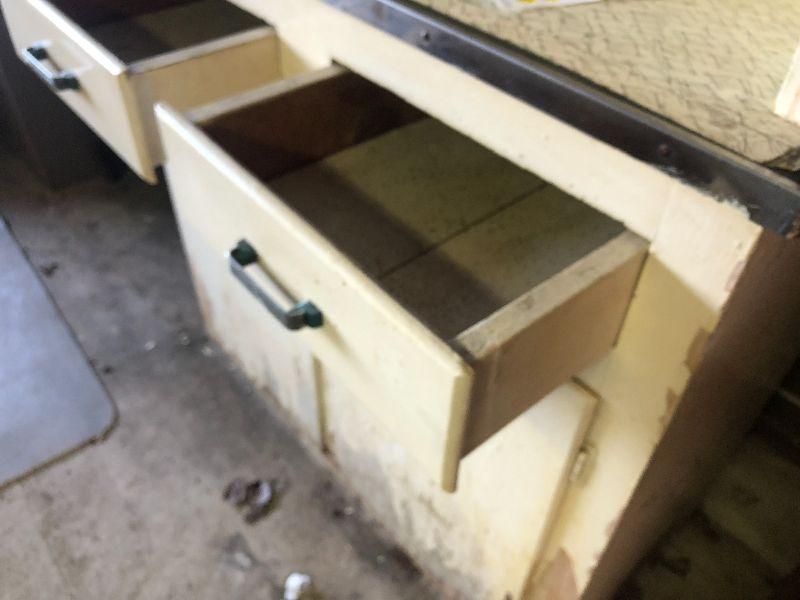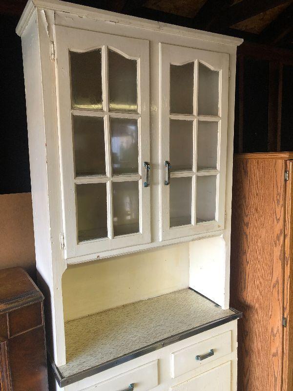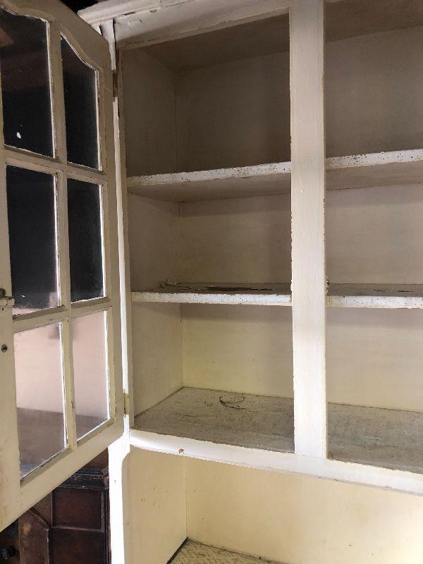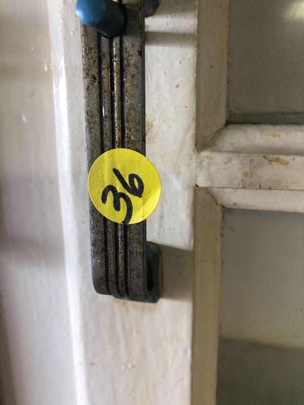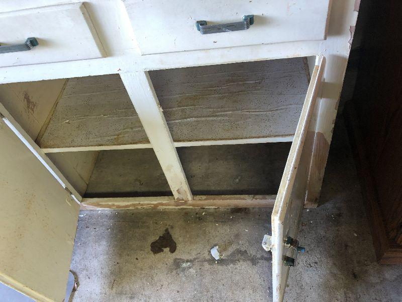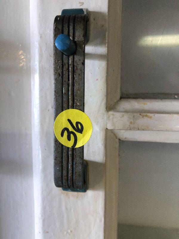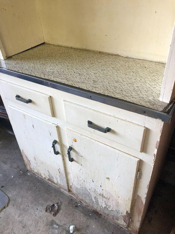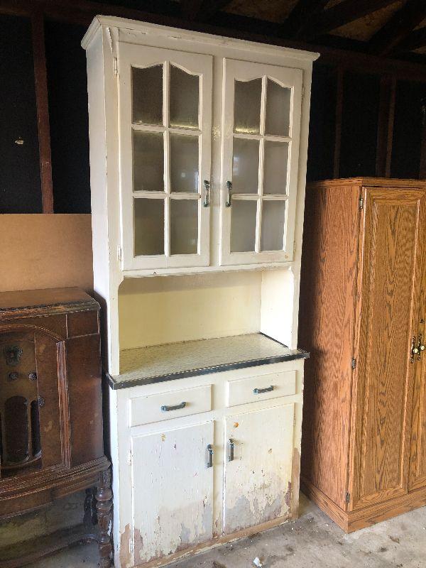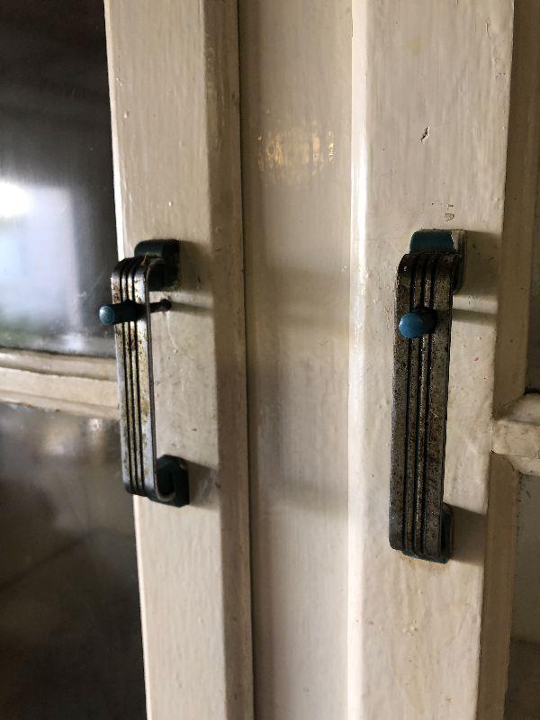 With a little elbow grease and paint, this will make a great cabinet! Check out the art deco, teal colored knobs! *Please review all photos for condition and contents of lot.