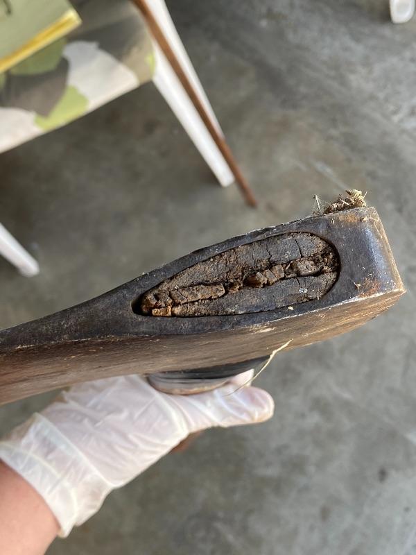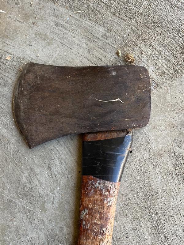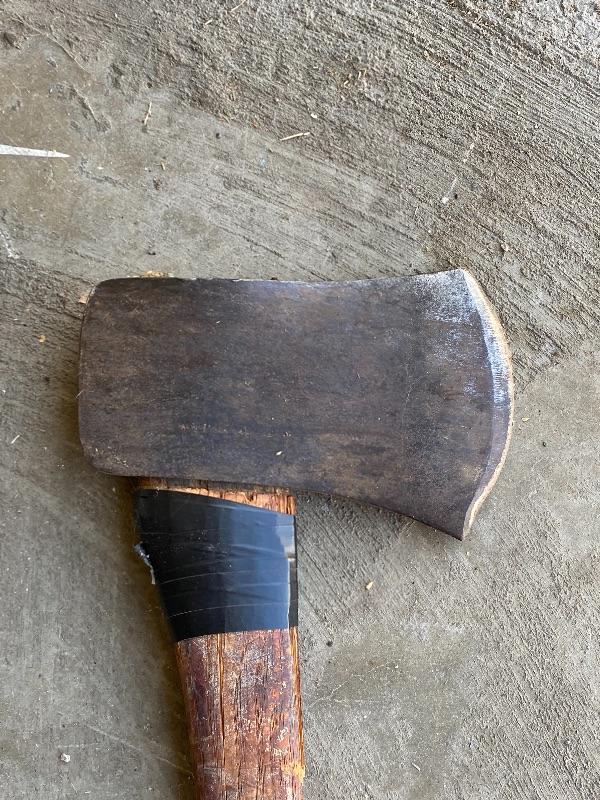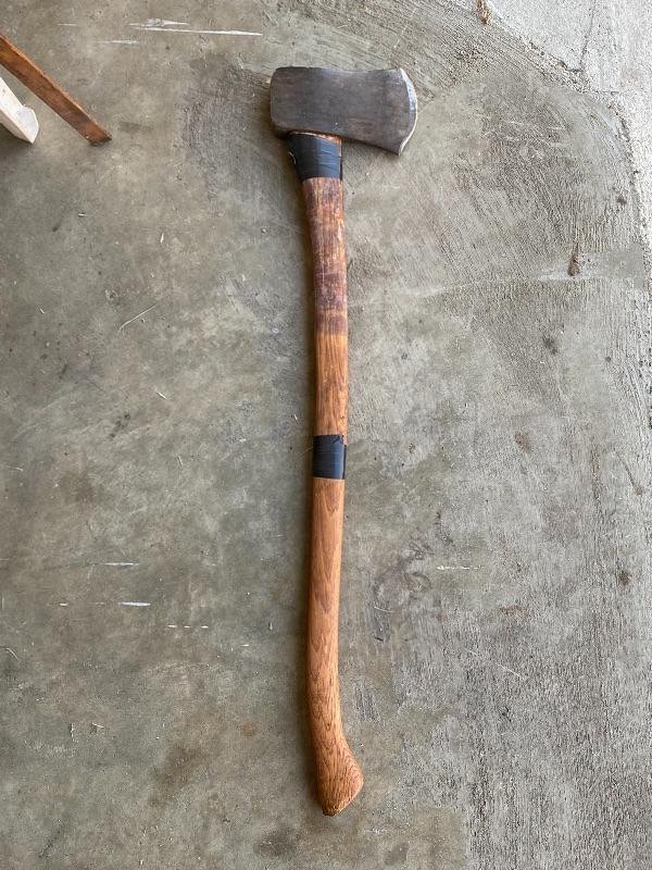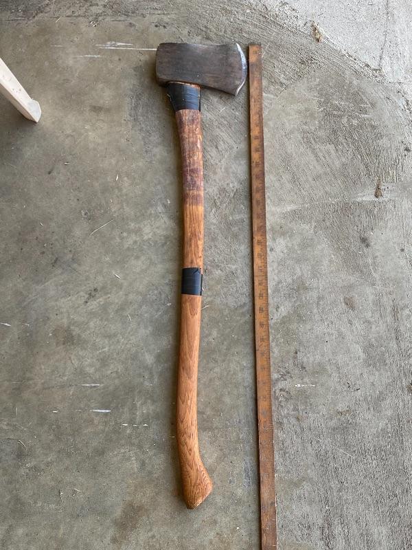 36" single edge ax. Wood handle. Handle has been taped do to cracks. In fair used condition. Blade has been sharpened by previous owner multiple times it looks like. Could not find an maker mark.