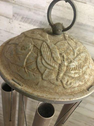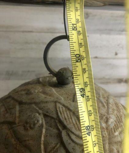 Great condition, some weathering 50" overall length. very nice deep sound on this chime. Cast iron top w/brass ring, wood disk to ring the chimes.