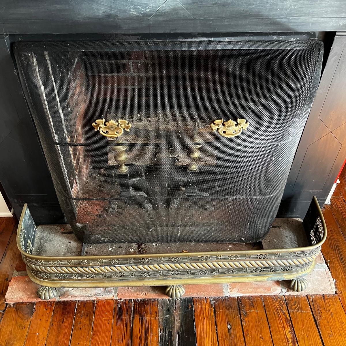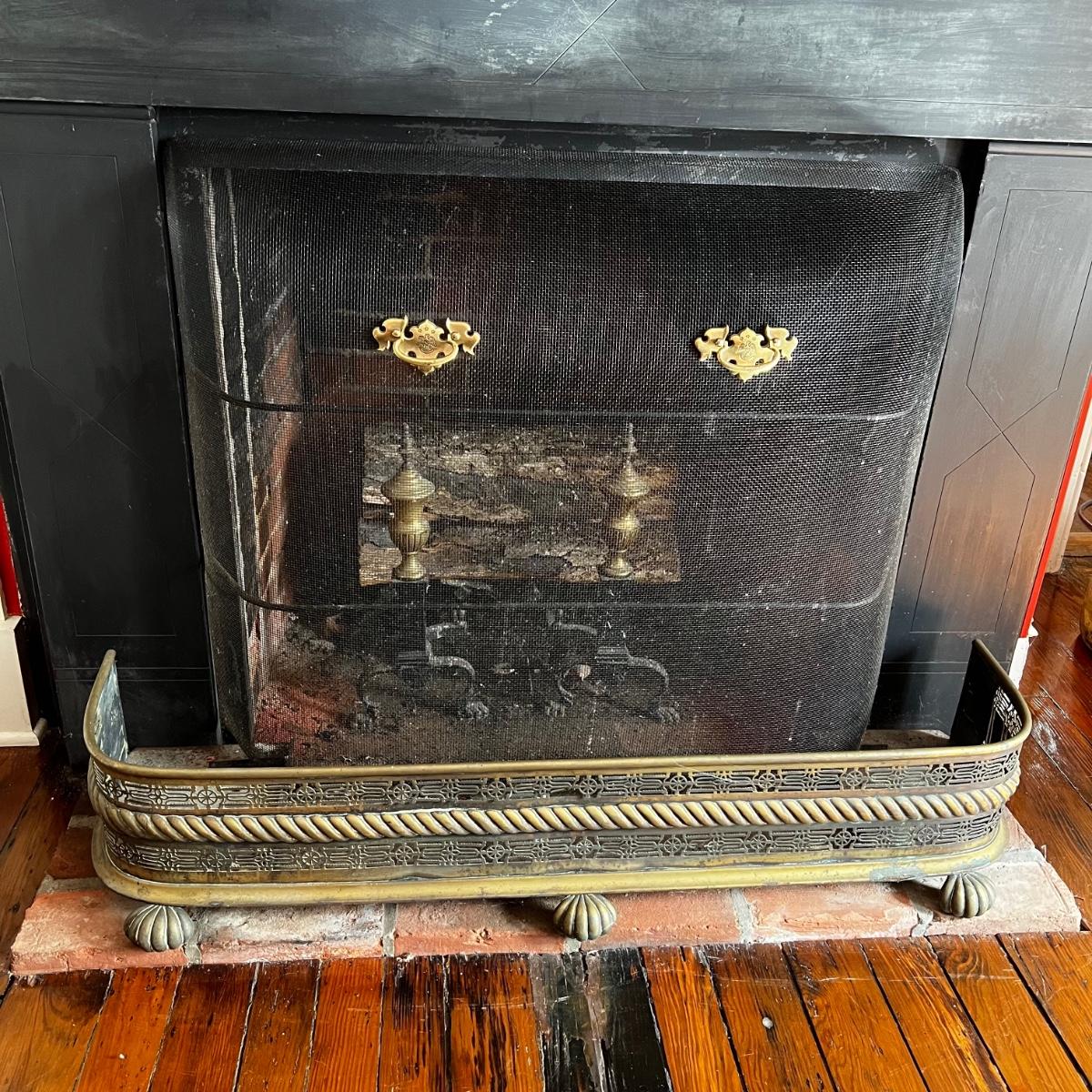 Fender is 48”W brass, fireplace screen has brass hardware.