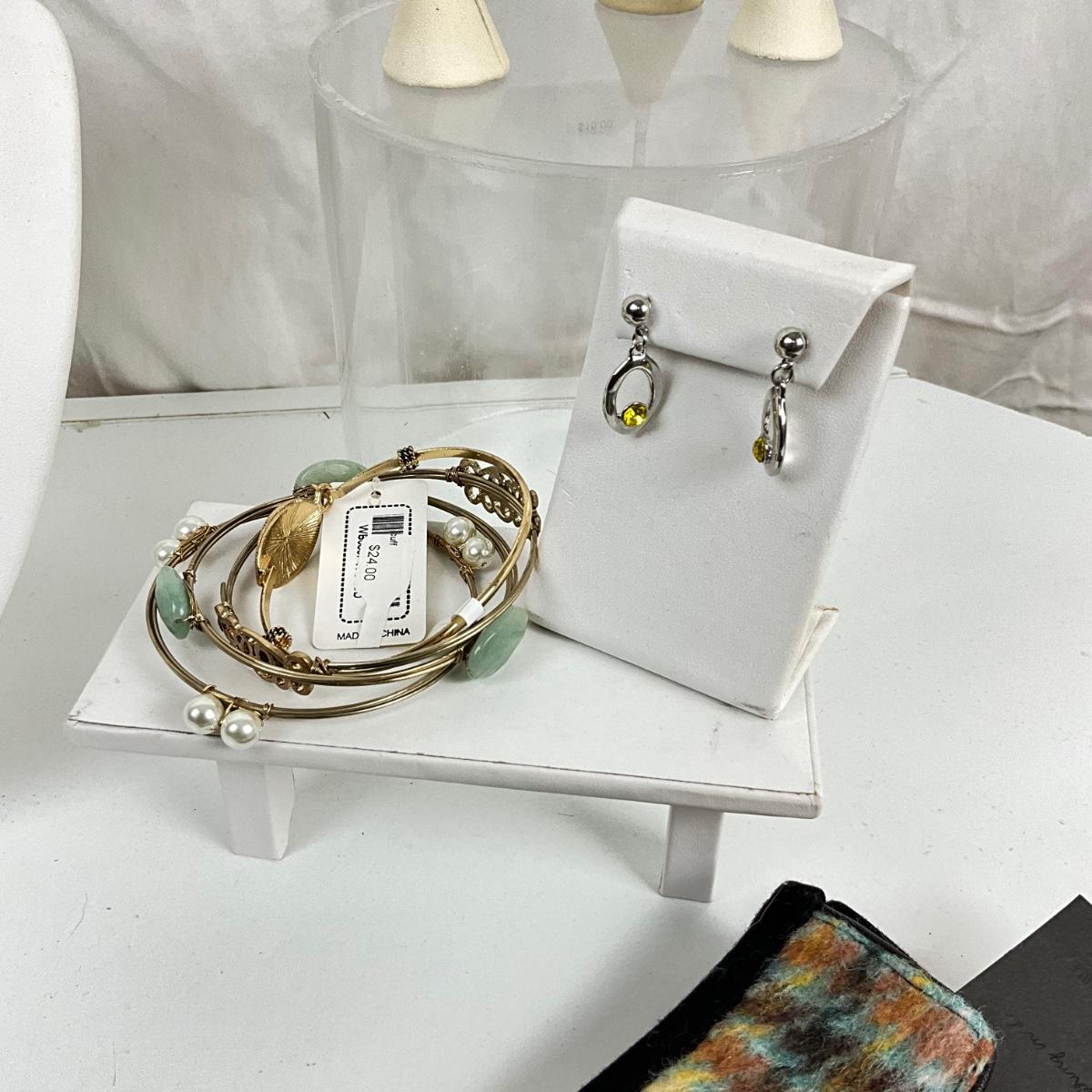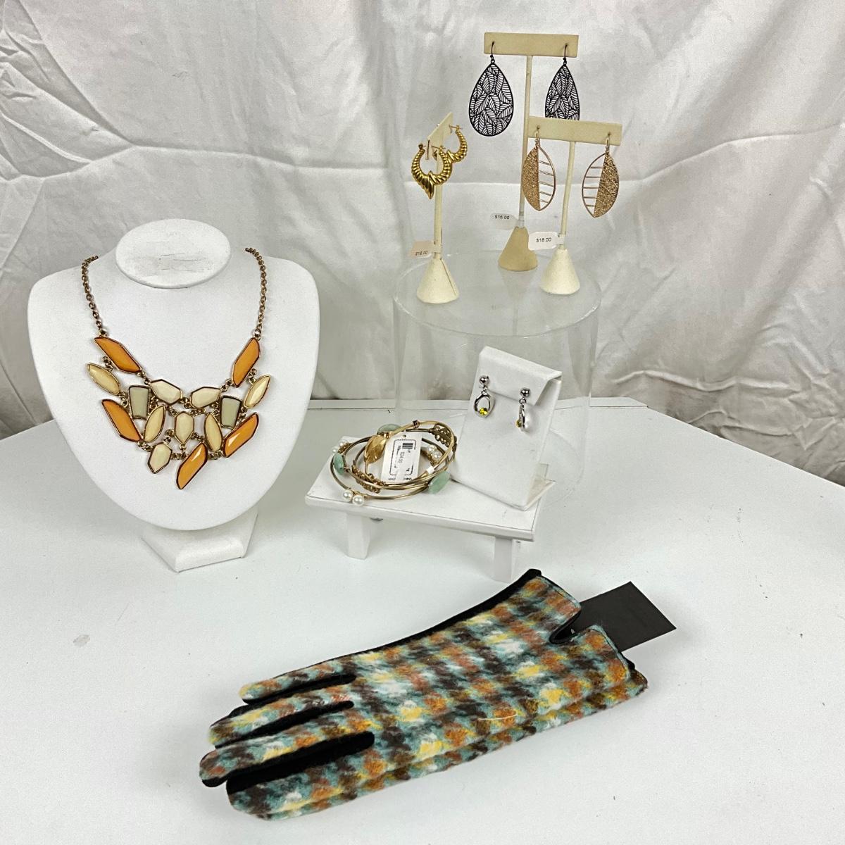 Several slip on bangles, 4 pairs of earrings, gloves, and necklace