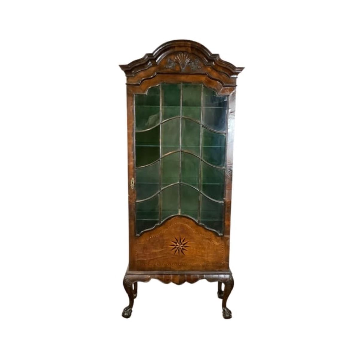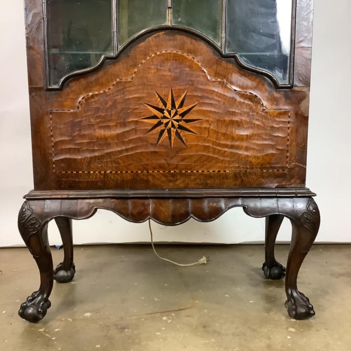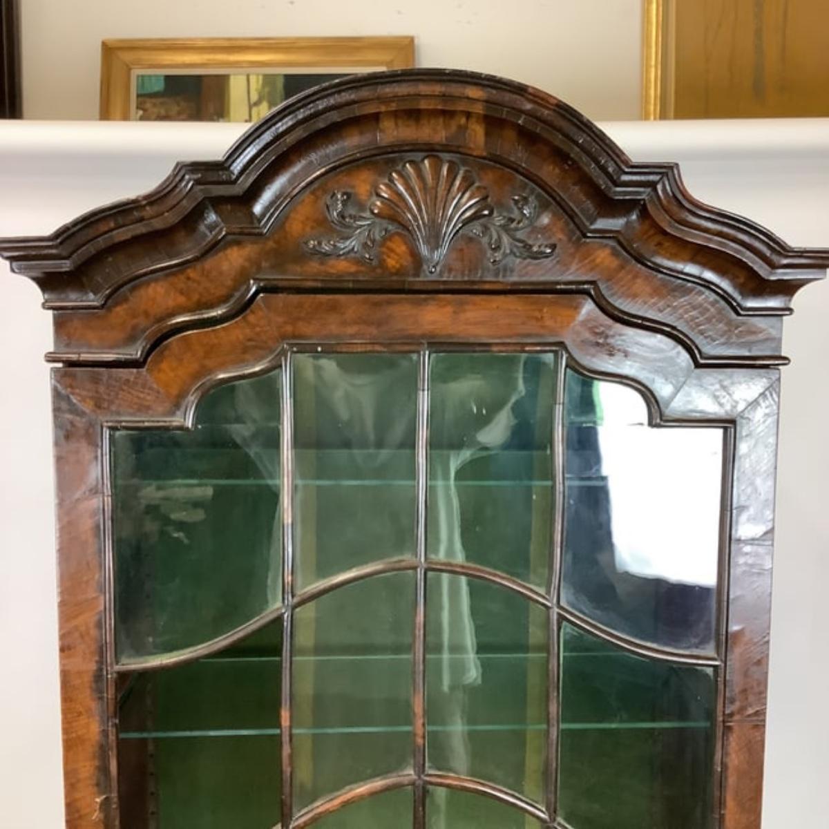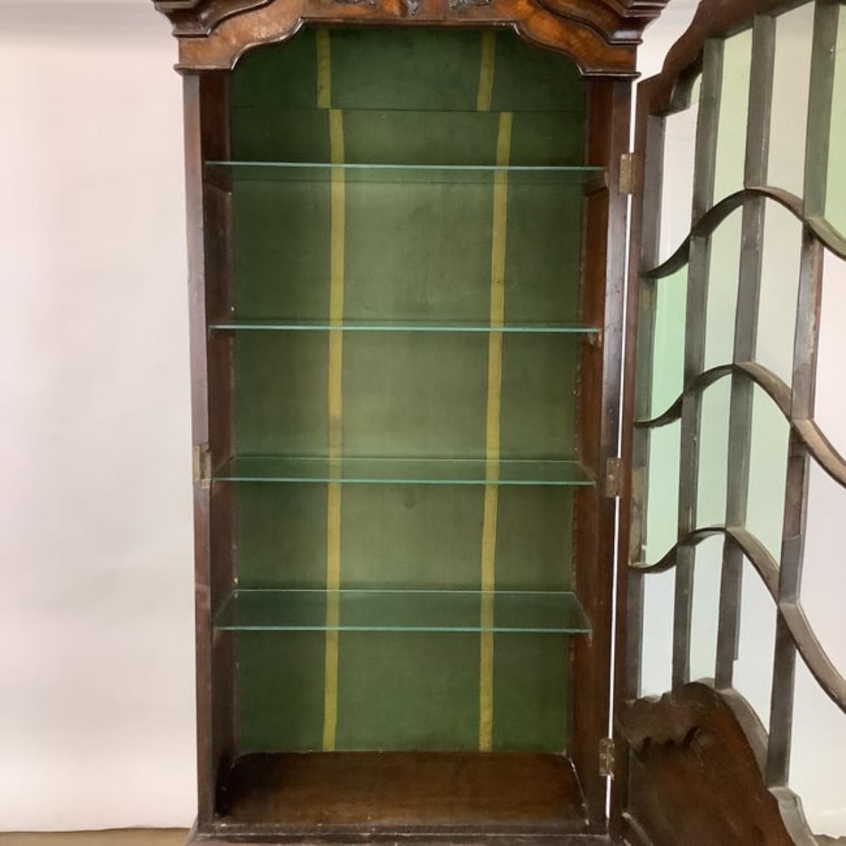 18th or early 19th century Continental vitrine, applied shell frieze at the top, arched mullions over glass, with compass inlay on the veneered bottom half, scalloped base, claw on ball feet. It has a built in light switch that plugs into the wall and it does turn on. 4 glass shelves that you can position at different heights. There is some lifting of the veneer and couple areas where it has chipped off; one piece of glass missing and one glass top right has two cracks. This piece measures 72"(6') high x 30.25" wide x 14" depth