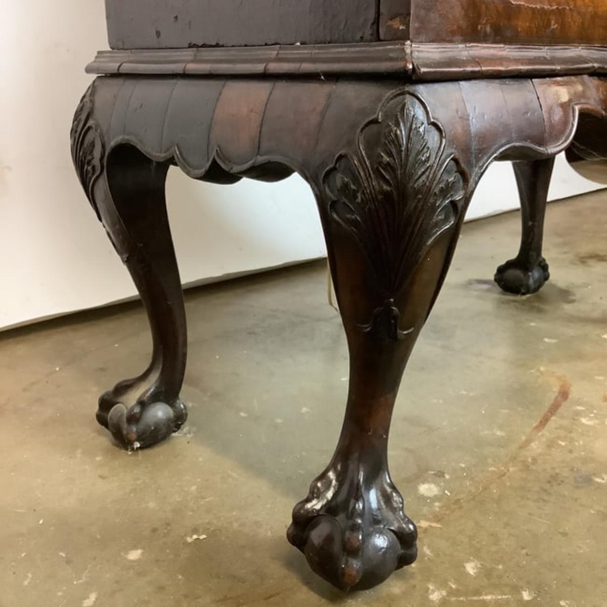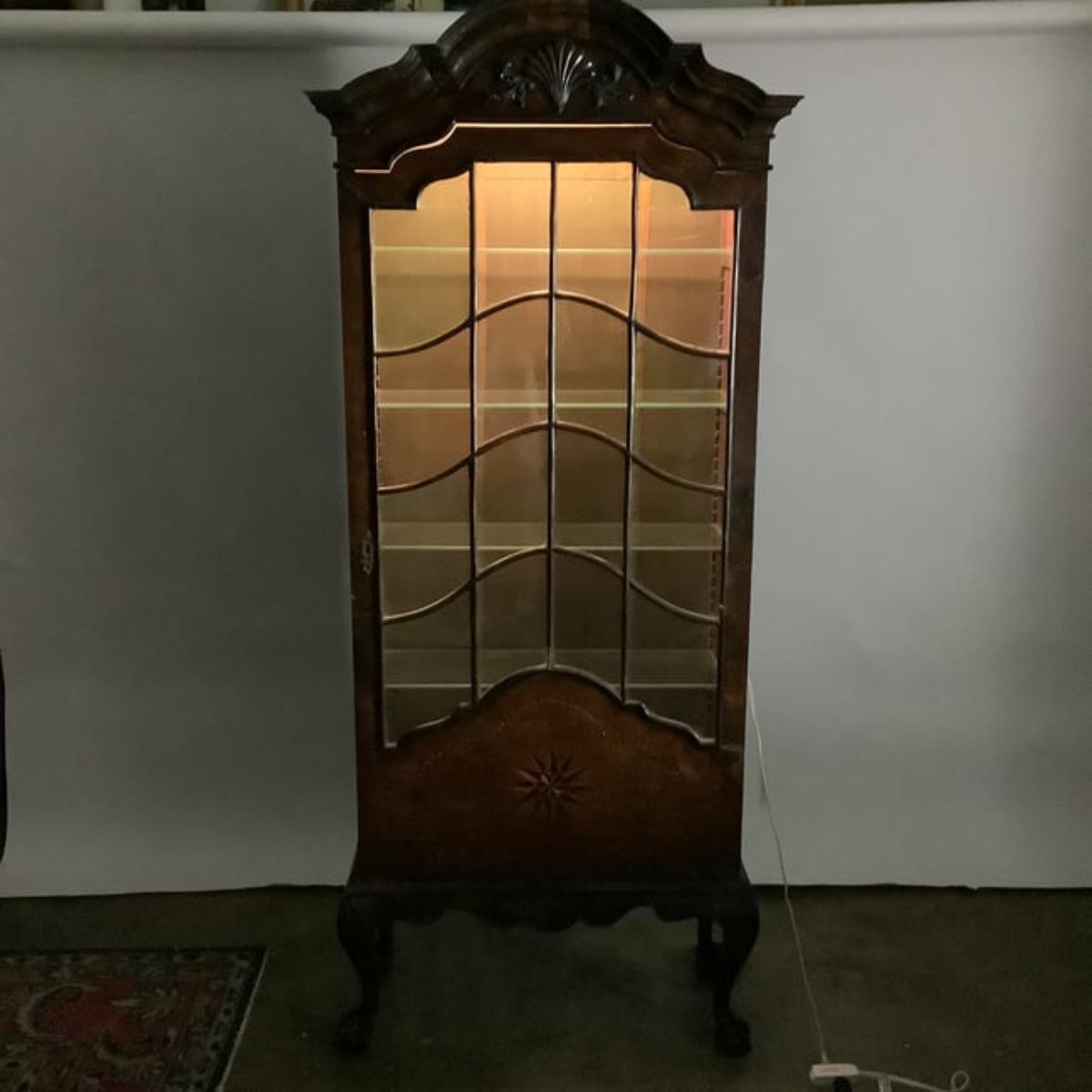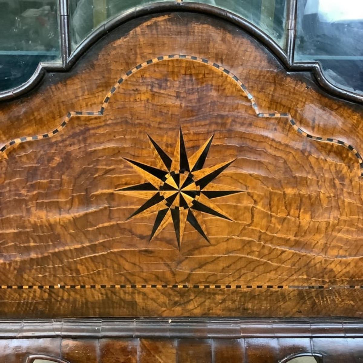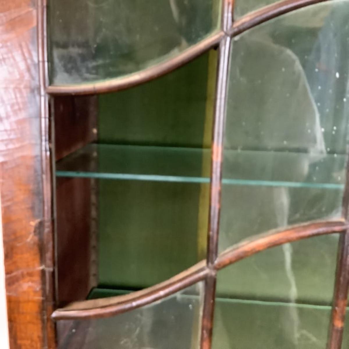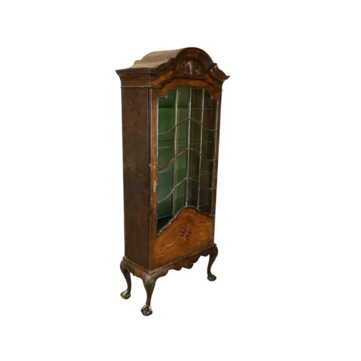 18th or early 19th century Continental vitrine, applied shell frieze at the top, arched mullions over glass, with compass inlay on the veneered bottom half, scalloped base, claw on ball feet. It has a built in light switch that plugs into the wall and it does turn on. 4 glass shelves that you can position at different heights. There is some lifting of the veneer and couple areas where it has chipped off; one piece of glass missing and one glass top right has two cracks. This piece measures 72"(6') high x 30.25" wide x 14" depth