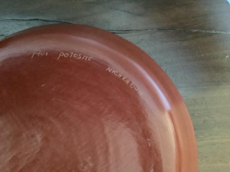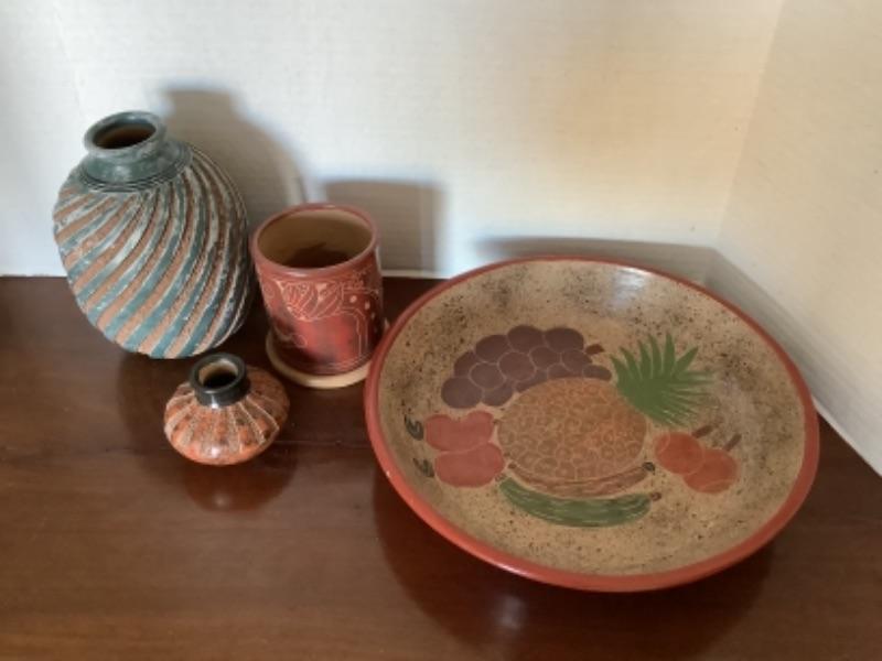 2 etched pottery vases, 1 etched pottery cup and 1 etched pottery fruit bowl signed Fior Potosite Nicaragua and measures 11-1/2” round