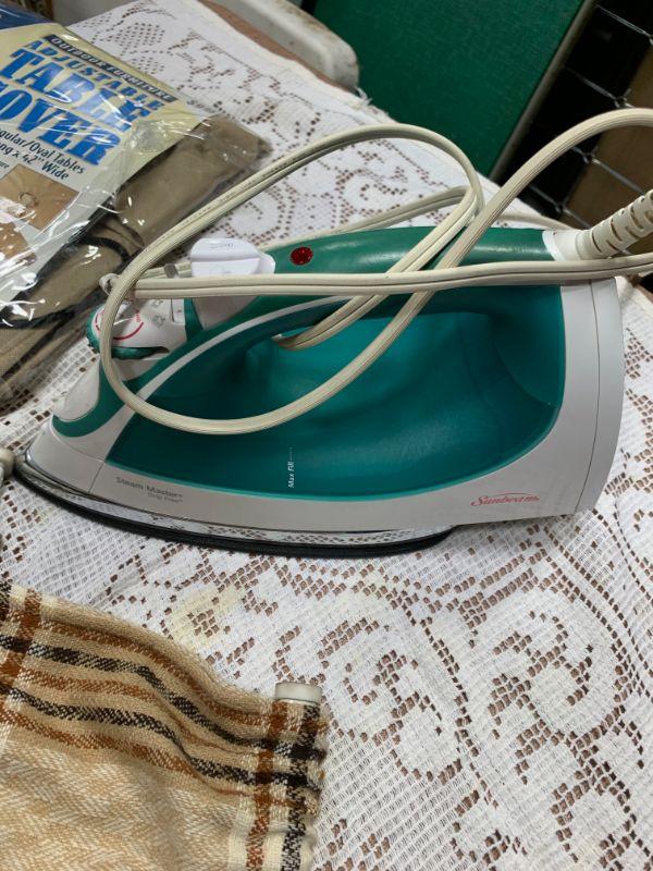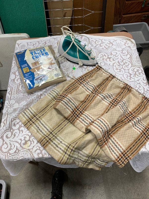 Lace table cloth, curtain rods and outdoor tablecloth.