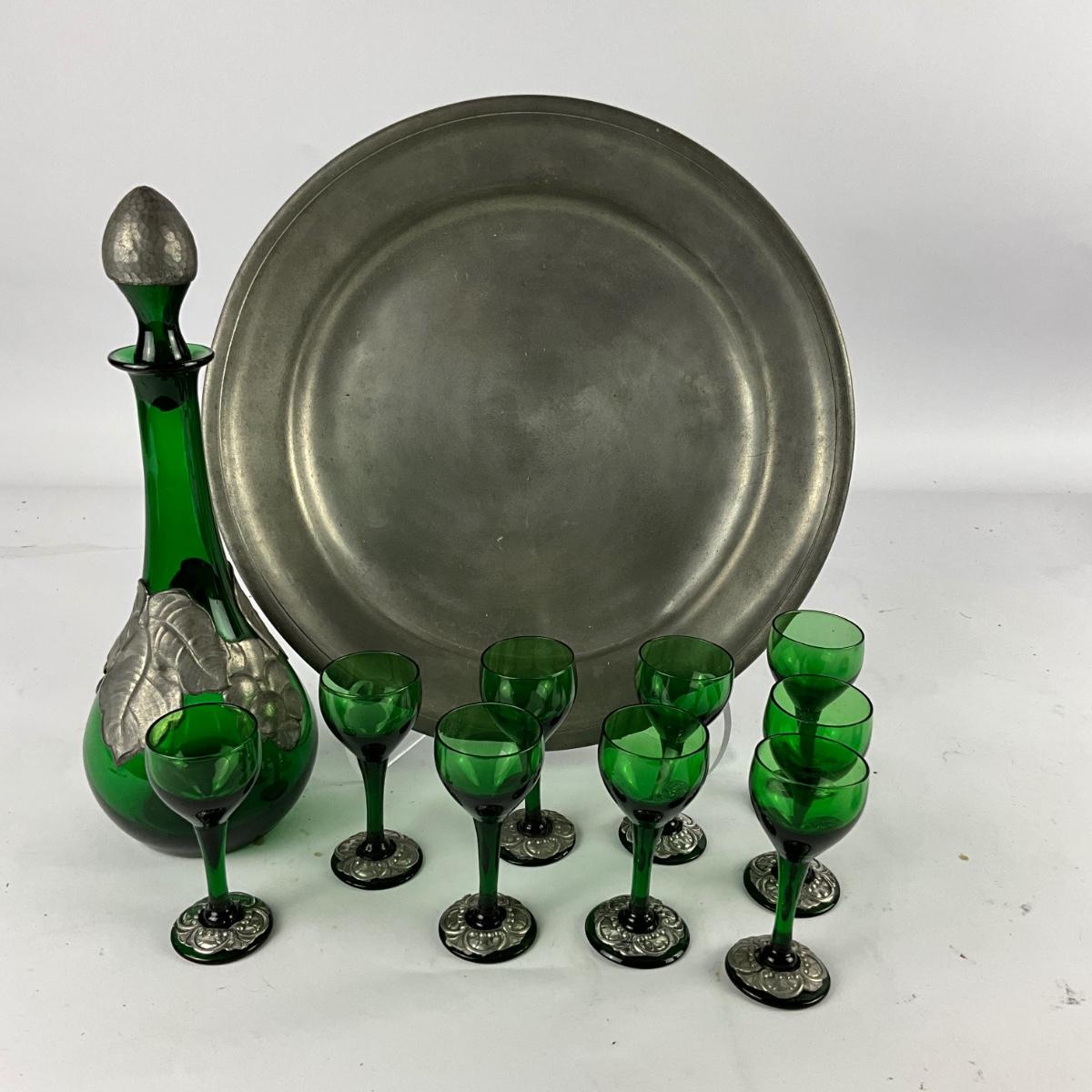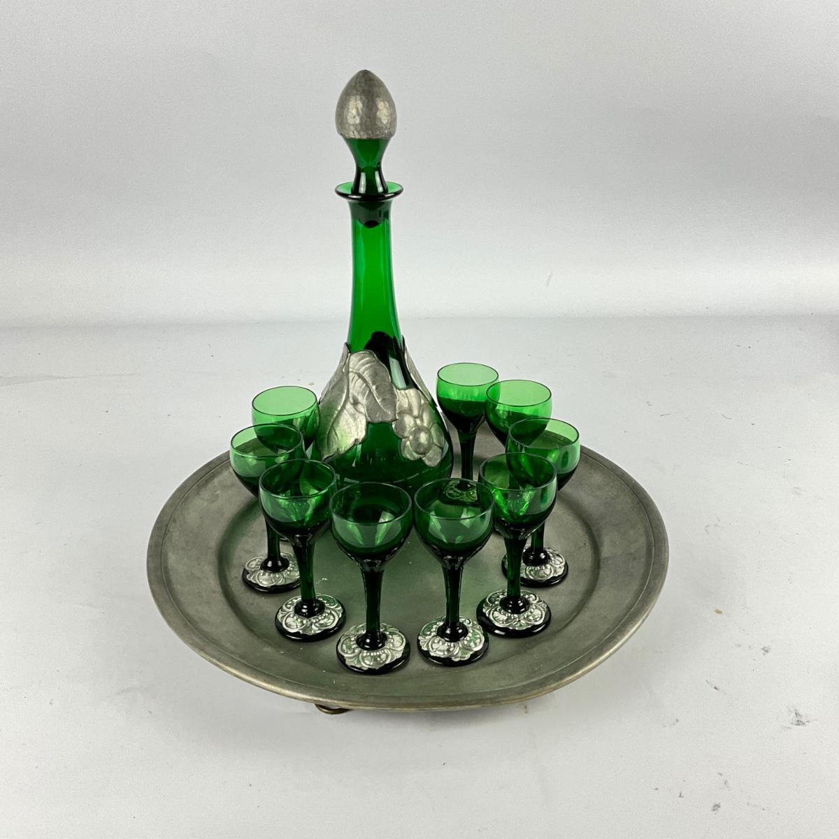 364 Vintage Pewter Green Glass Cordial Decanter Lot