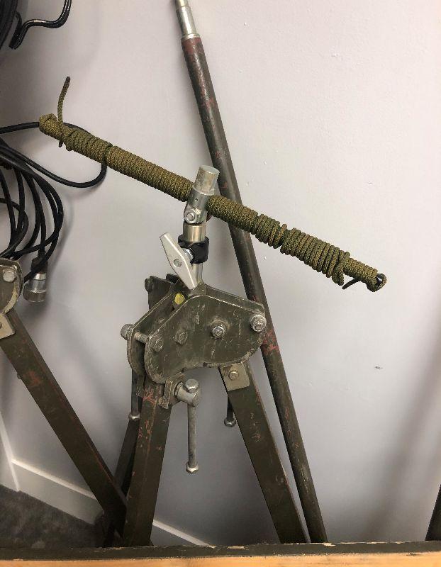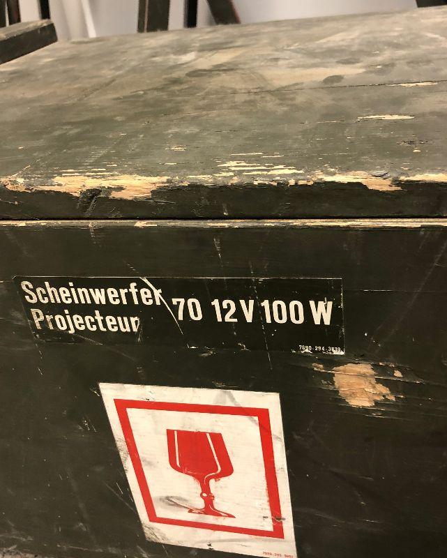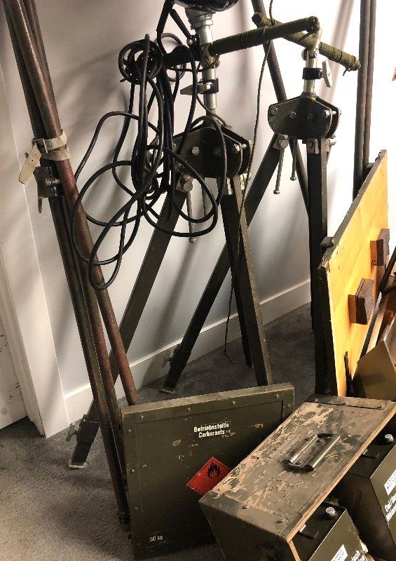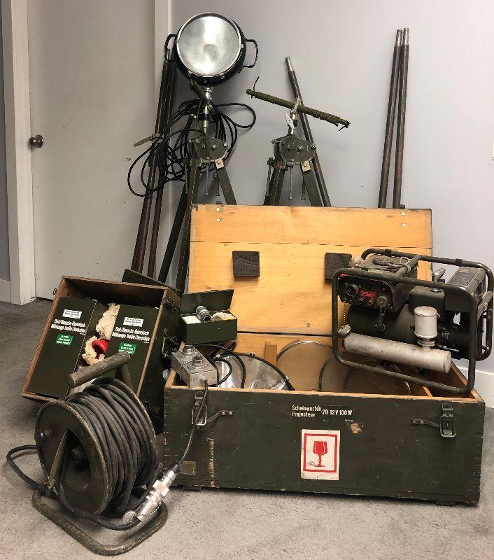 Vintage SWISS Military Generator Light Plant. what you see is what you get a small 2 cycle 12 volt/100W generator, 2 spot lights with tripods and extension poles, extension cables foot locker, extra lenses, gas & oil cans. This is in working condition, although the generators carb may need to be cleaned before operation. I have 4 complete sets available for sale. Very cool set up for your cabin or remote property, Preppers, emergency lights for remote repairs. Swiss quality!