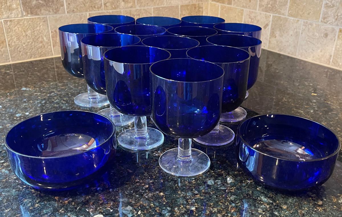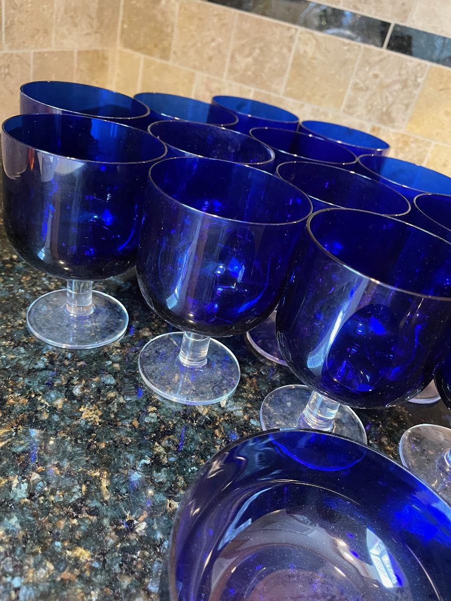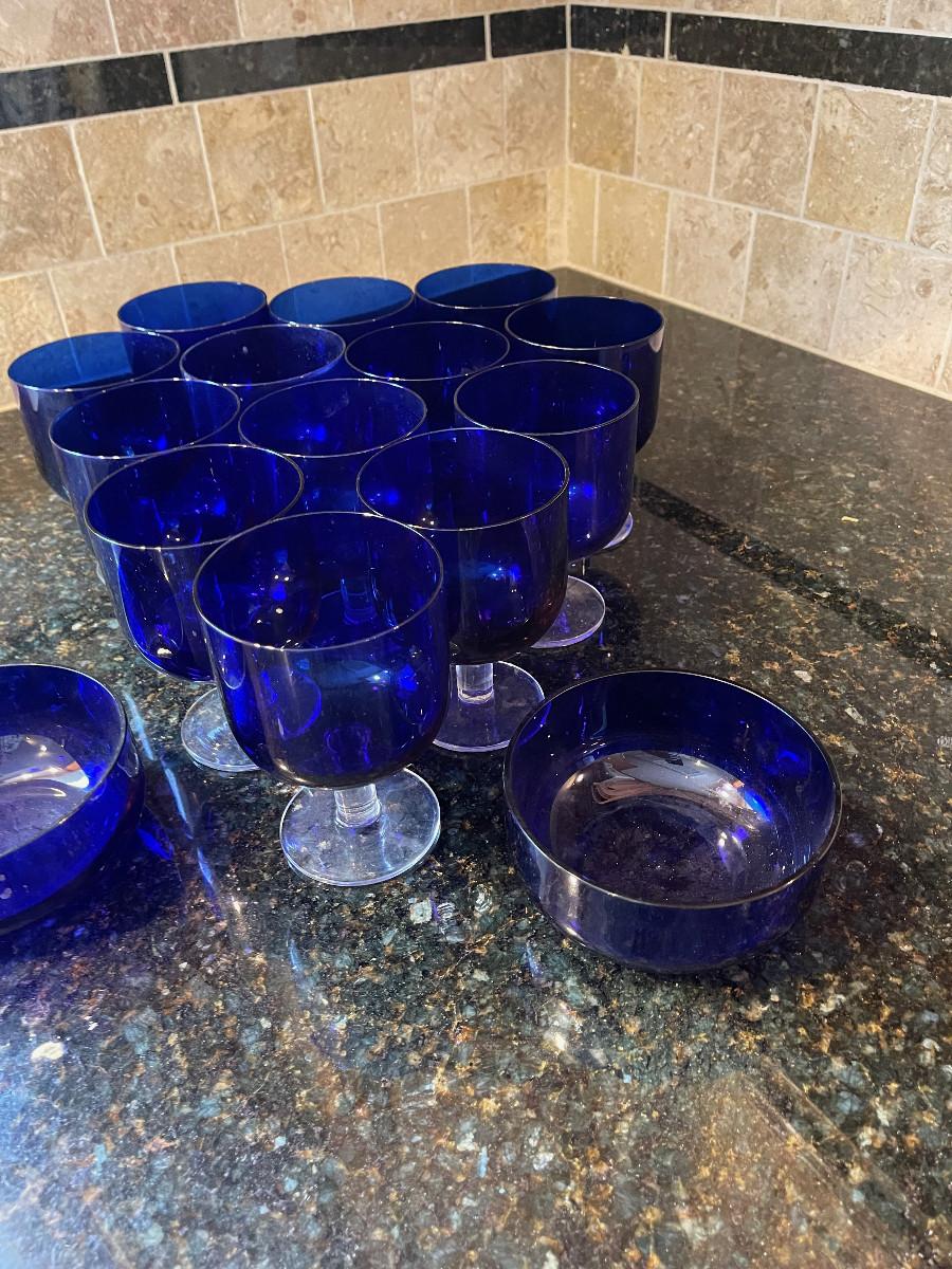 #368 13 Blue Goblets and 2 Cobalt Blue Bowls