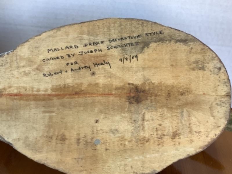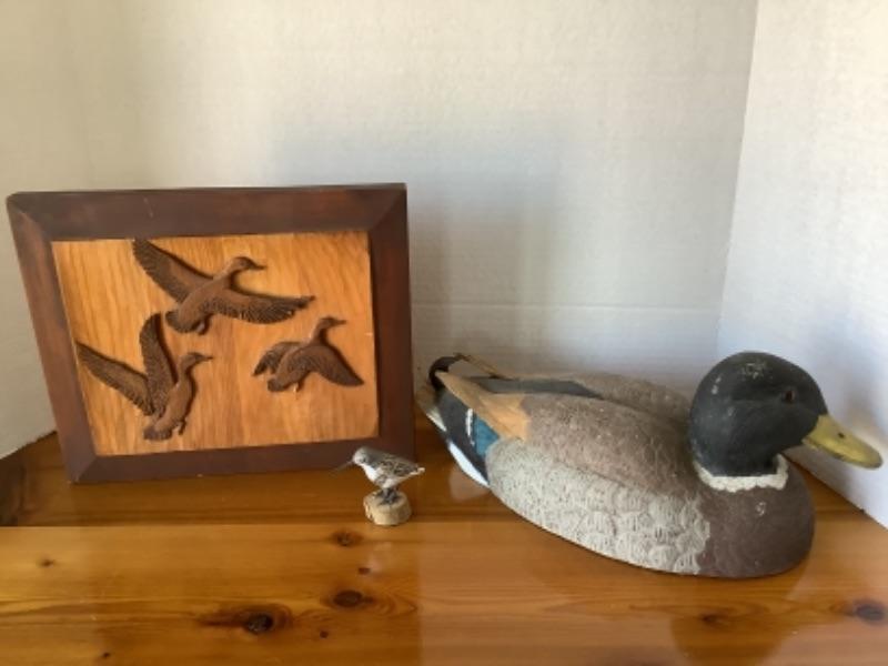 Hand carved wood Mallard drake decoy signed by Joseph Schacter 1989, small Sand Piper decor and Wood Goose wall decor