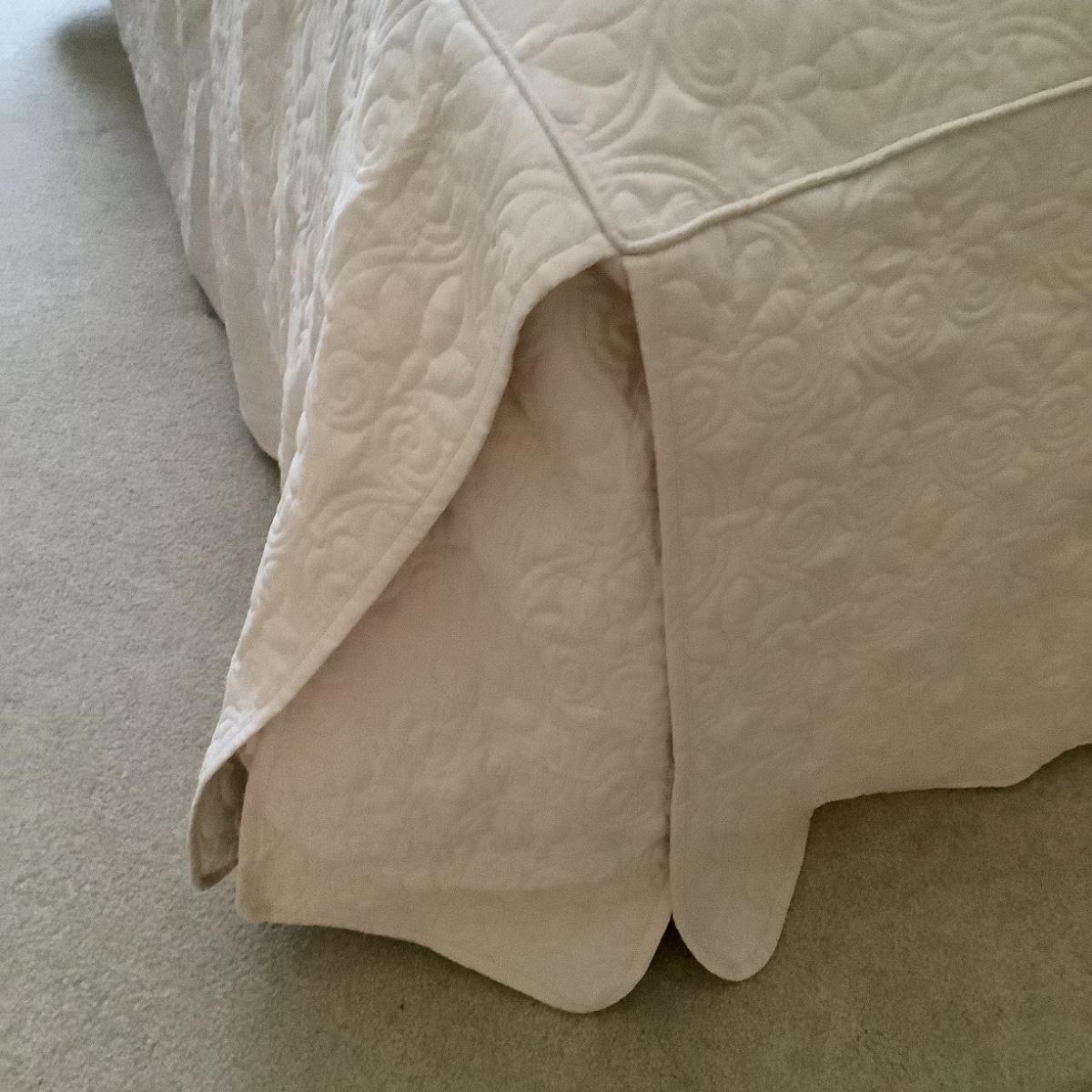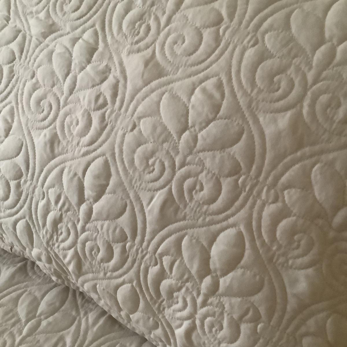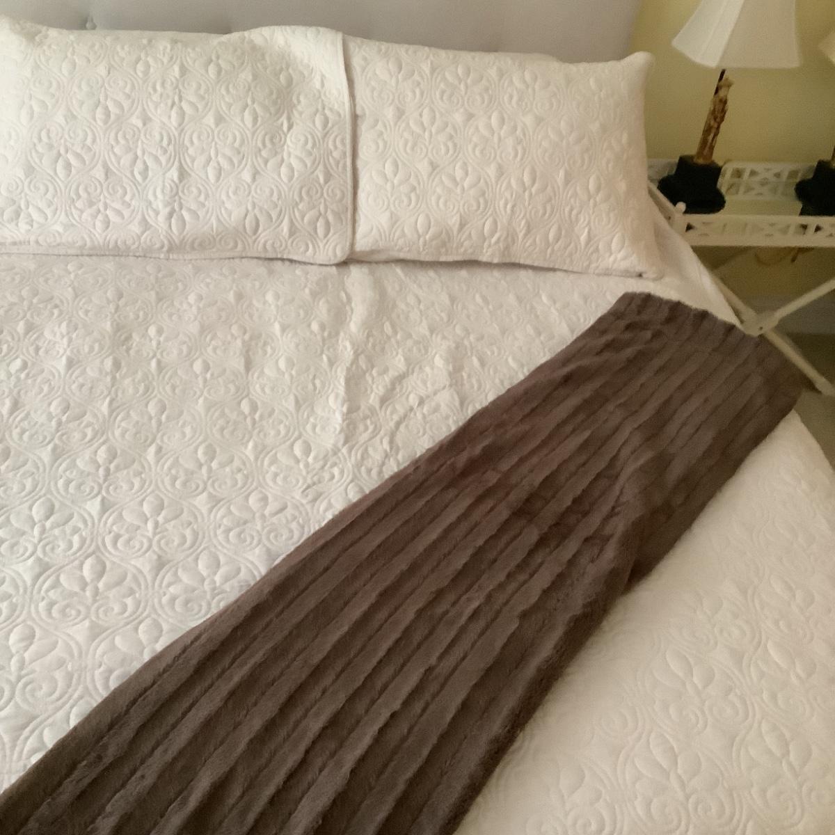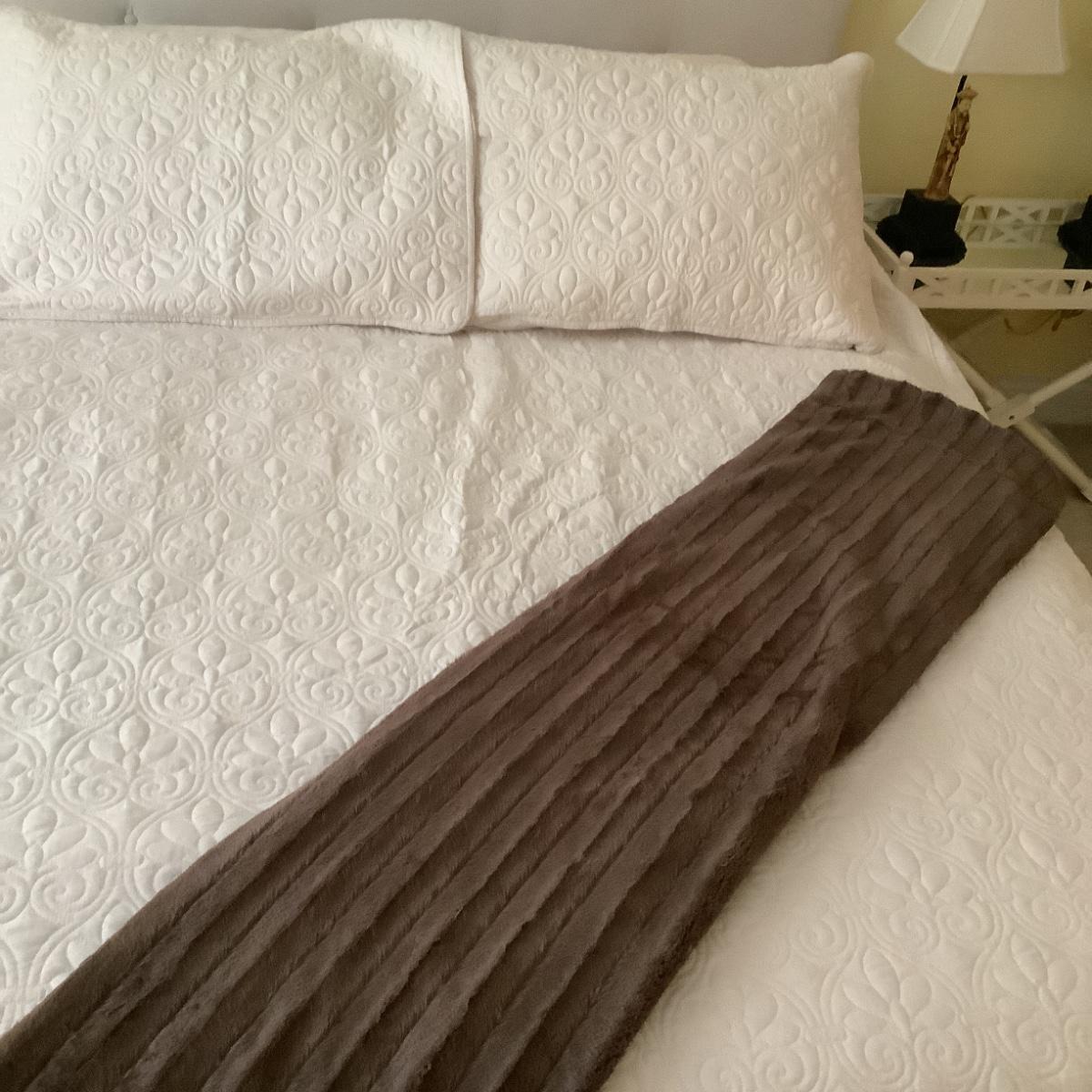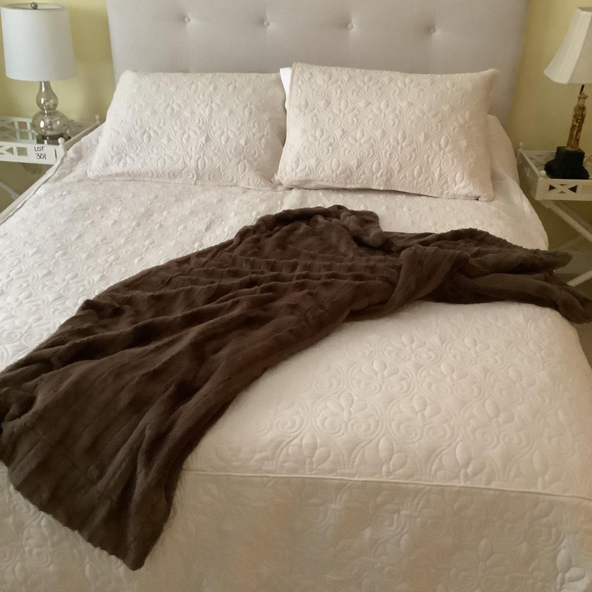 Fitted queen bedspread with two matching standard pillow covers with brown faux fur throw blanket