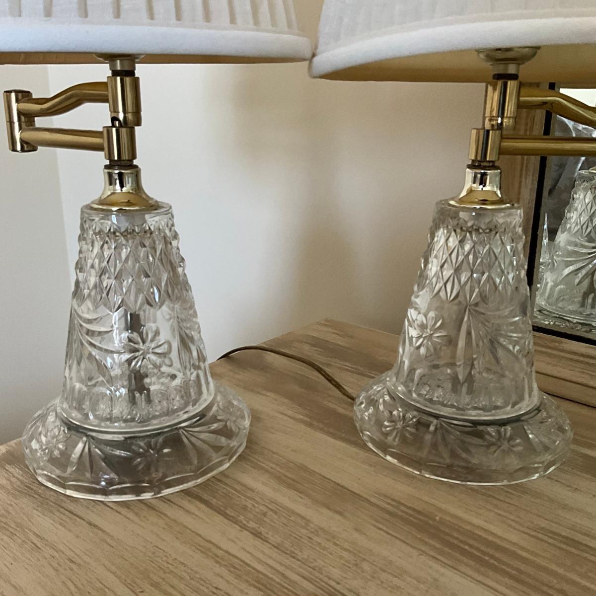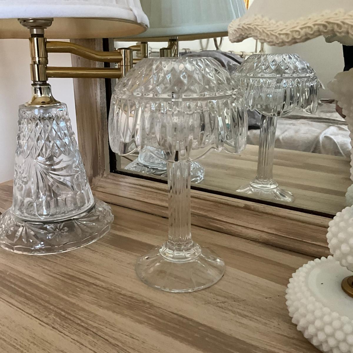 Lot includes: Two table lamps with cut glass style base, one candle holder