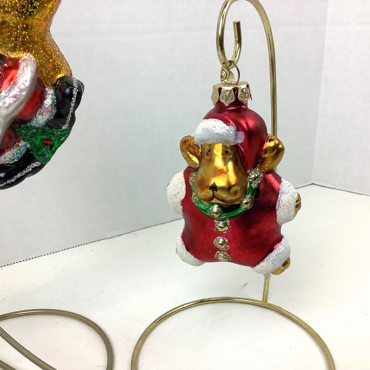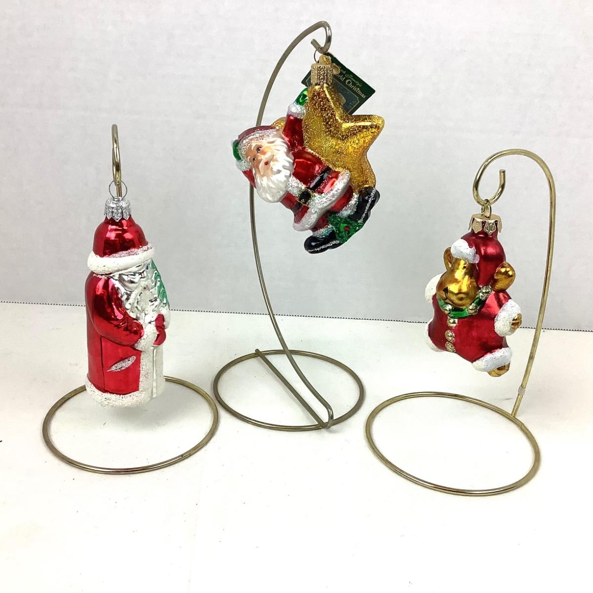 There are 3 ornaments, approximately 4" tall. There is a Santa, Santa on a star and Dog dressed as Santa.