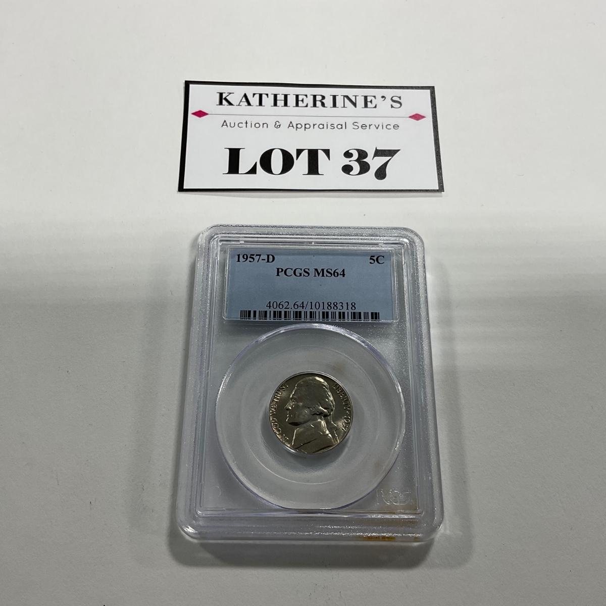 One graded 1957-D Jefferson Nickel PCGS MS64 coin. Please see photos for details and condition. ::: Shipping is available on this lot. If you require shipping you must let us know at the close of the auction. We will coordinate with you after the item has been won. Shipping fees will include insurance up to or exceeding the value of all items being mailed. If you have any questions regarding this lot please contact the auctioneer either via this website, by direct email or by phone. PICK UP TIMES and other important information can be found in the TERMS and DESCRIPTION of the auction. Please take a look for pertinent information. Thanks!