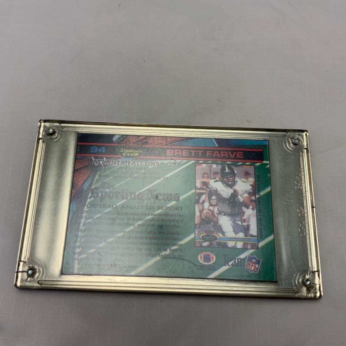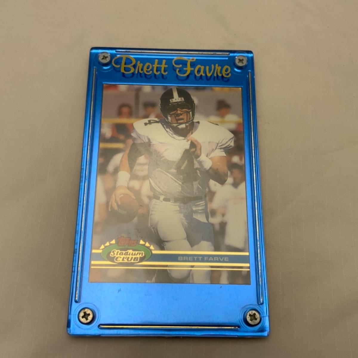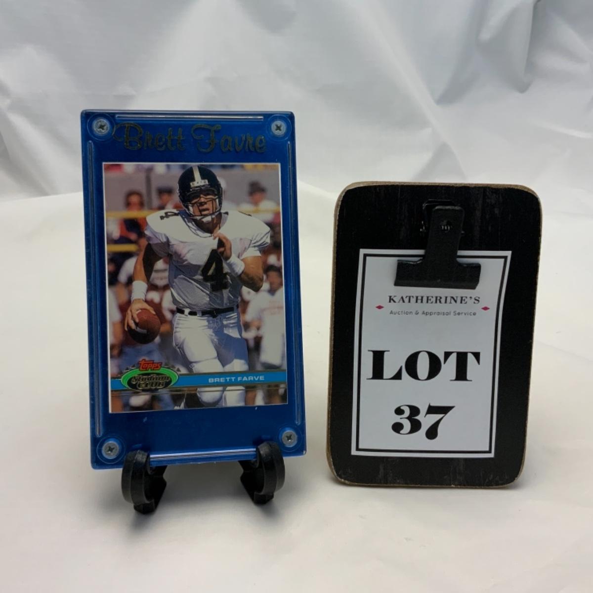 1991 Brett Favre Rookie TOPPS Stadium Club. Favre’s last name is misprinted on the card front and back swapping the R and the V. Card comes in plaque that is labeled correctly. Card could be removed and sent in for grading. Please see photos for details and condition. ::: Shipping is available on this lot. If you require shipping you must let us know at the close of the auction. We will coordinate with you after the item has been won. Shipping fees will include insurance up to or exceeding the value of all items being mailed. If you have any questions regarding this lot please contact the auctioneer either via this website, by direct email or by phone. PICK UP TIMES and other important information can be found in the TERMS and DESCRIPTION of the auction. Please take a look for pertinent information. Thanks!