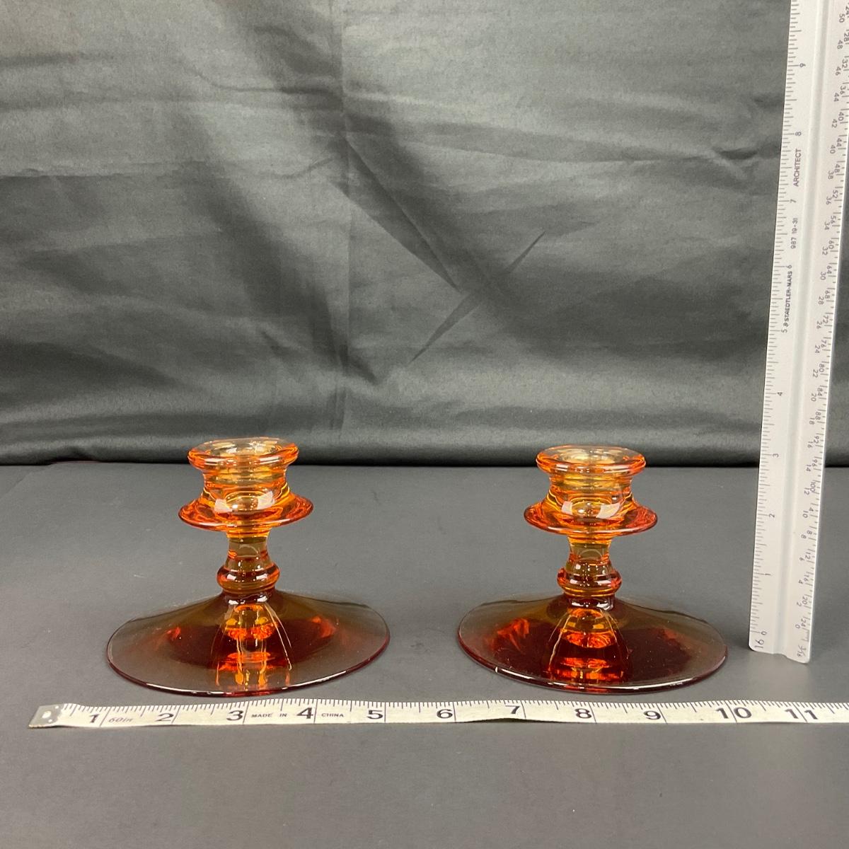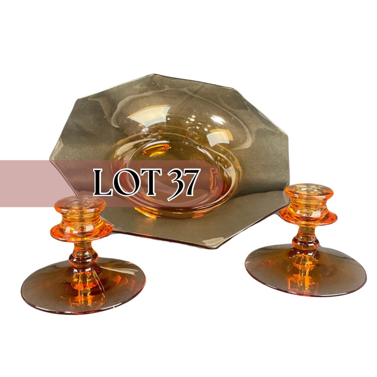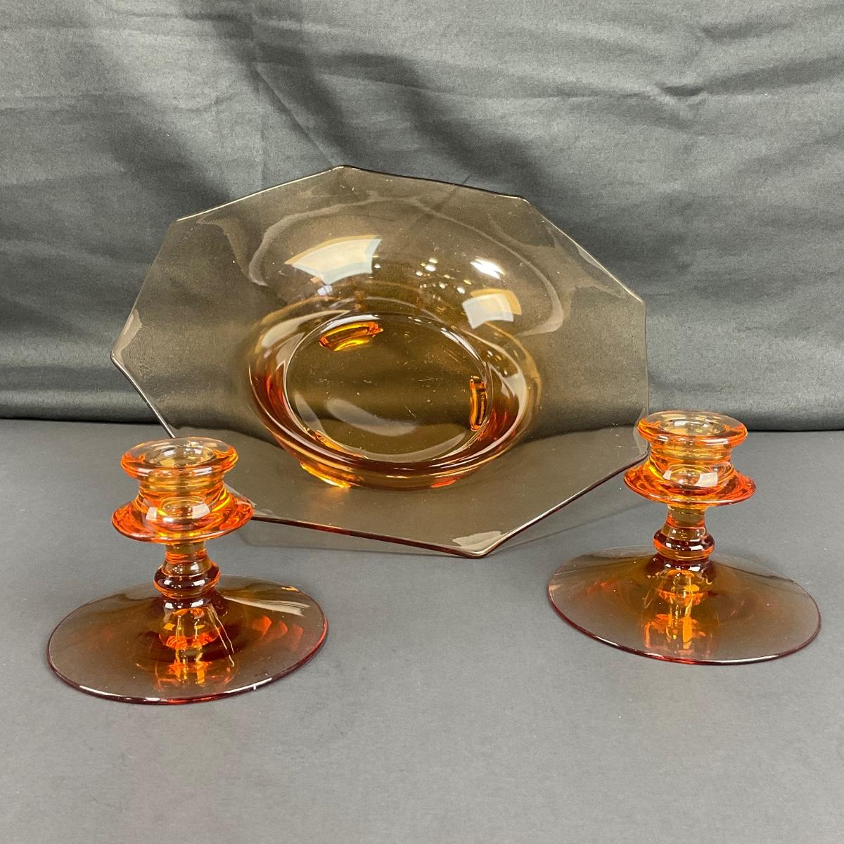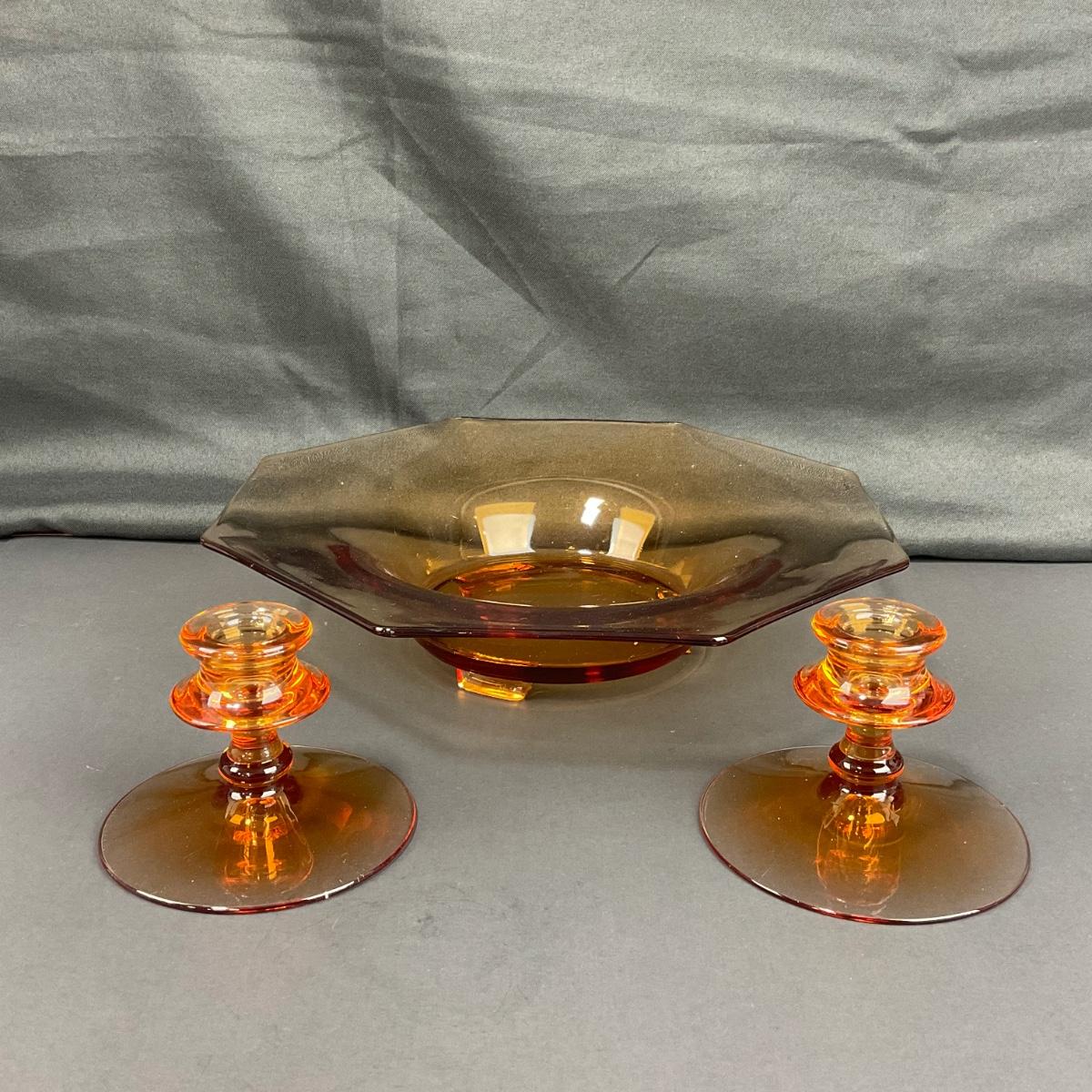 -37- FOSTORIA | Amber Glass Console Bowl & Candlestick Holders