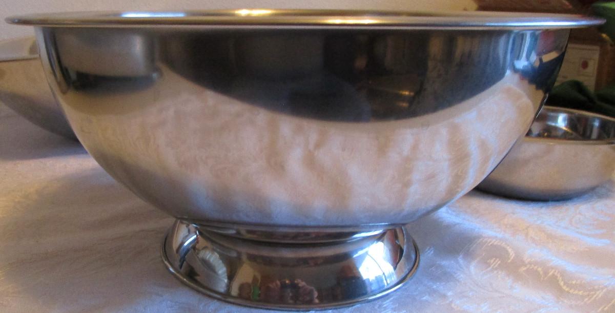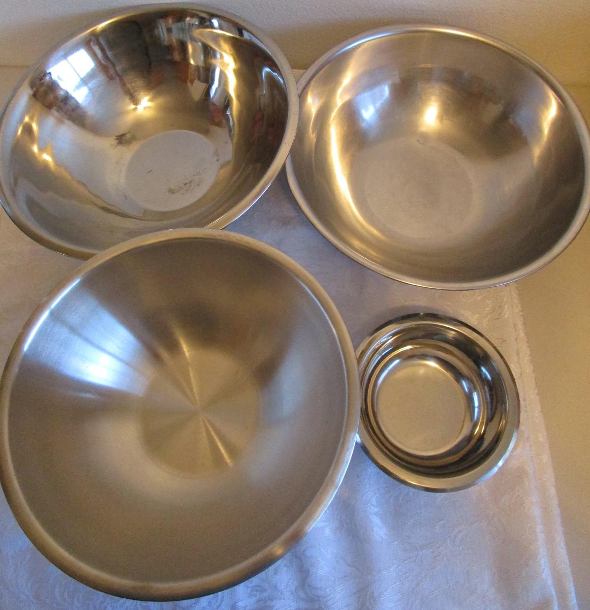 Sizes (2) 12 1/2"x 5 deep, (1) 11" x 4 1/2 deep (has little stand under bowl), (1) 6"x 2 1/2" deep