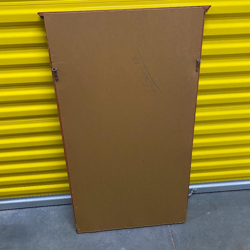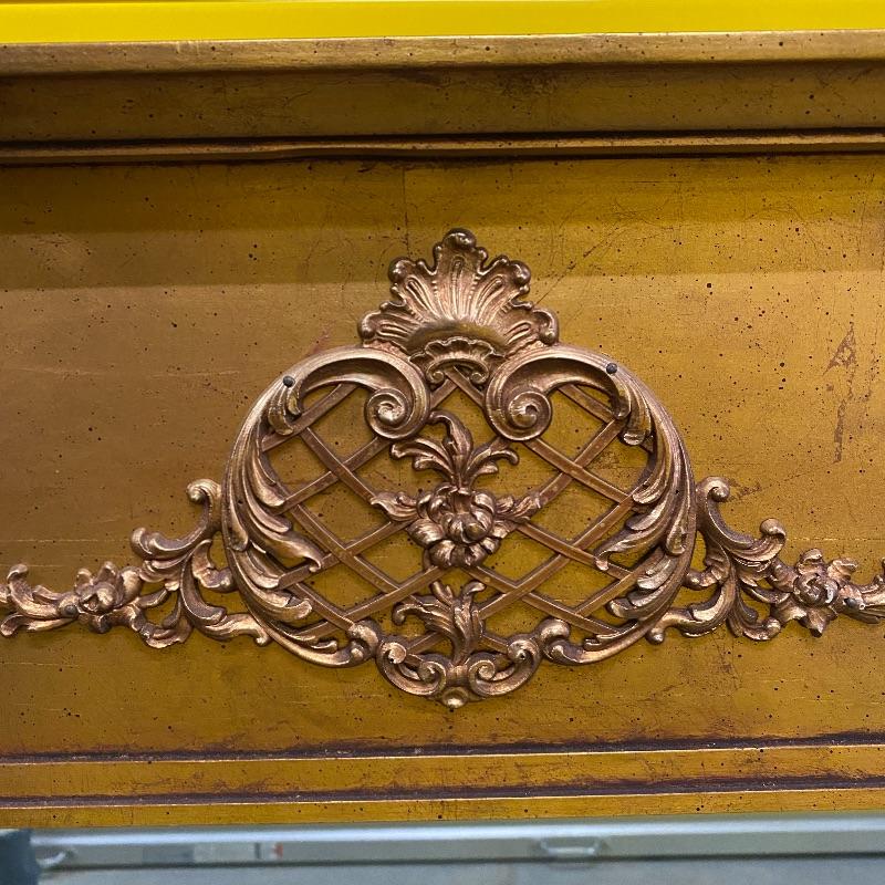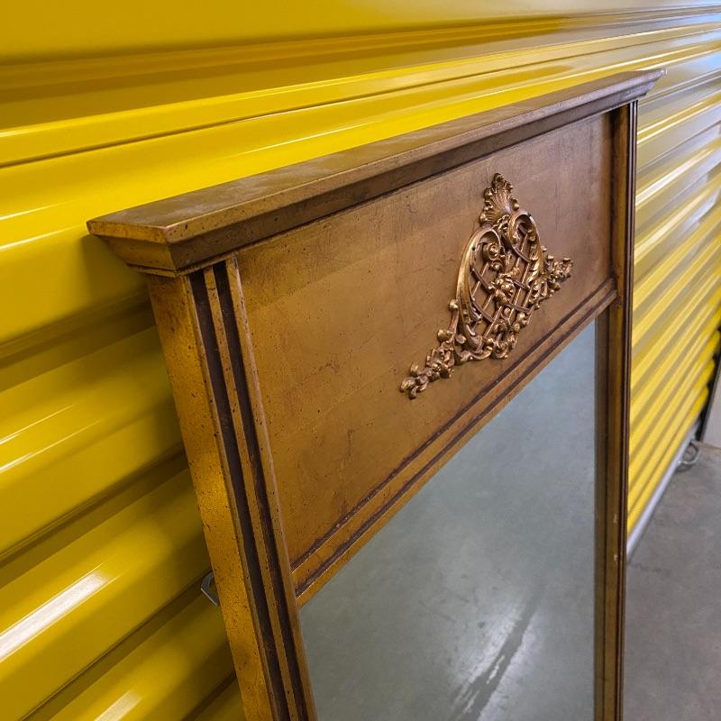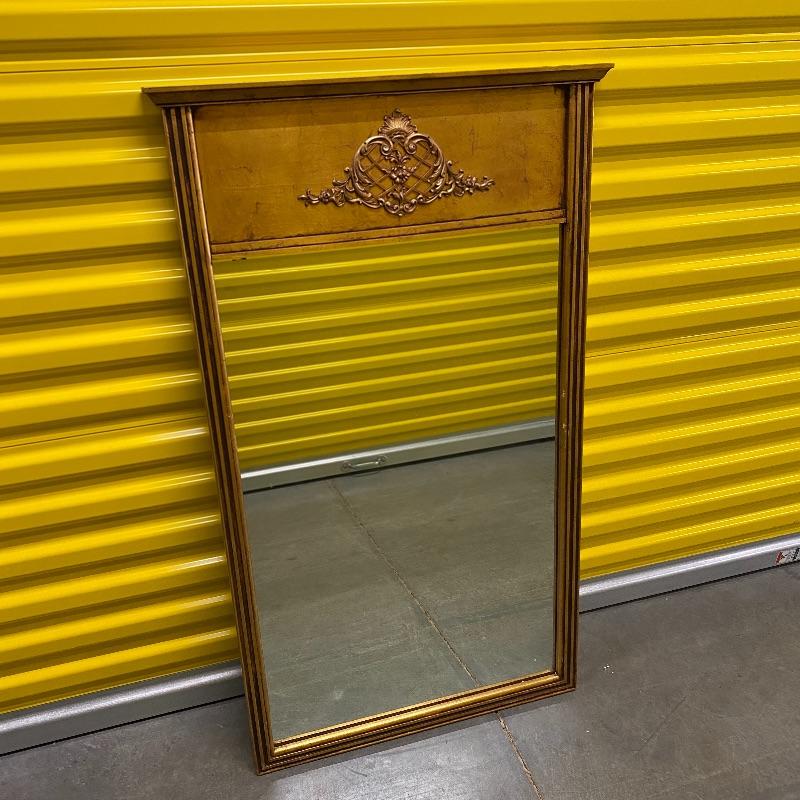 Heavy rectangular gold framed mirror with intricate design on top. 25.5” w x 44”l
