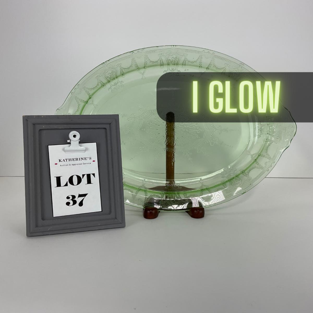 One Green Depression Cameo “Ballerina” Hocking Glass Co. (1930-1934) large platter. I am Uranium glass so I DO GLOW under blacklight. Please see photos for details and condition. ::: Shipping is available on this lot. If you require shipping you must let us know at the close of the auction. We will coordinate with you after the item has been won. Shipping fees will include insurance up to or exceeding the value of all items being mailed. If you have any questions regarding this lot please contact the auctioneer either via this website, by direct email or by phone. PICK UP TIMES and other important information can be found in the TERMS and DESCRIPTION of the auction. Please take a look for pertinent information. Thanks!