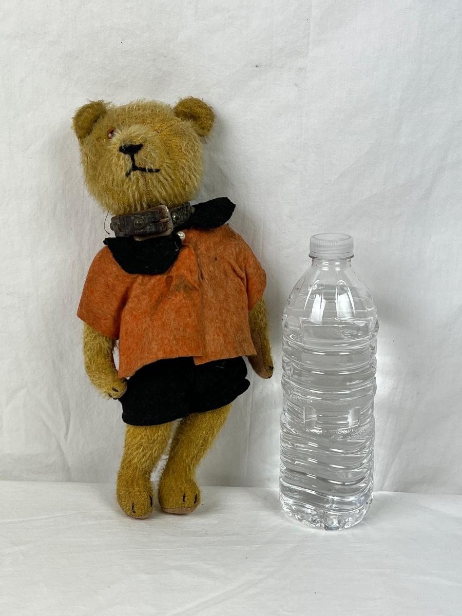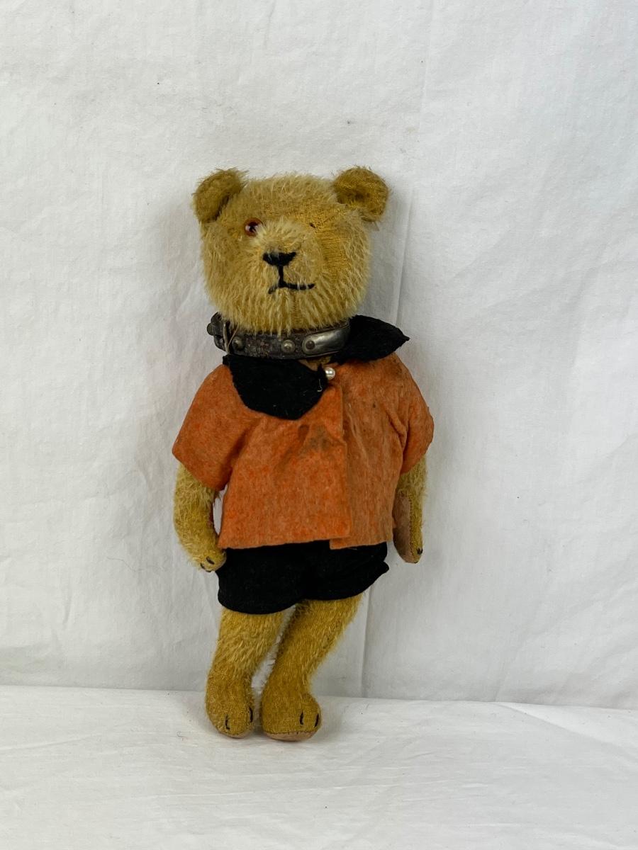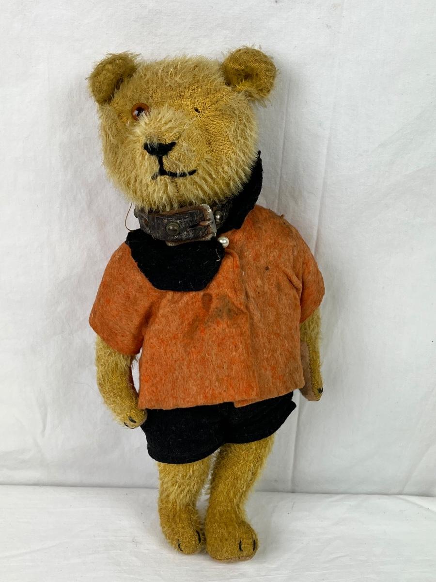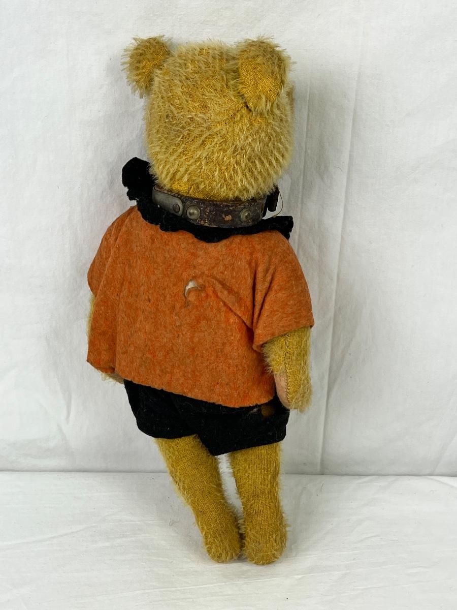 Steiff teddy bear made of mohair, jointed arms & legs. with leather collar. It is missing a eye and doesn’t have original clothing on.