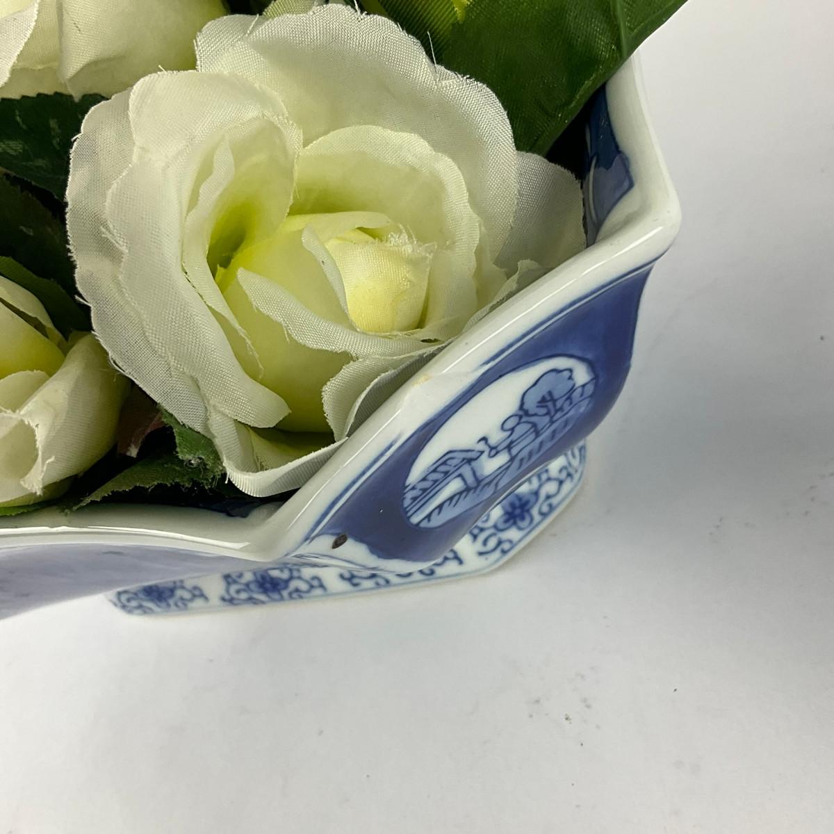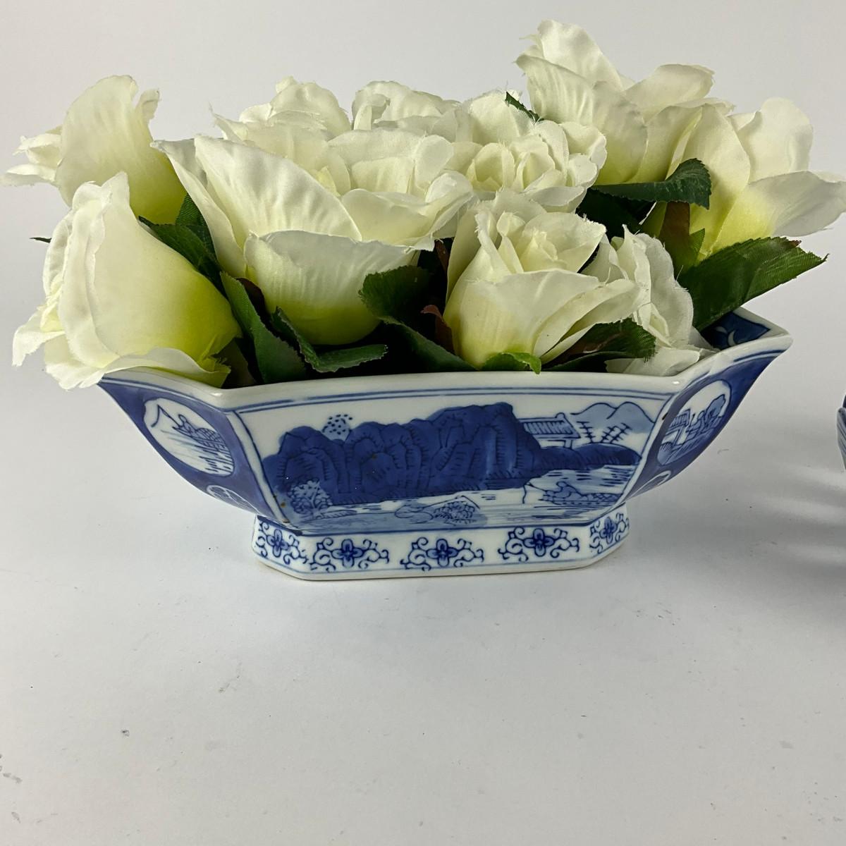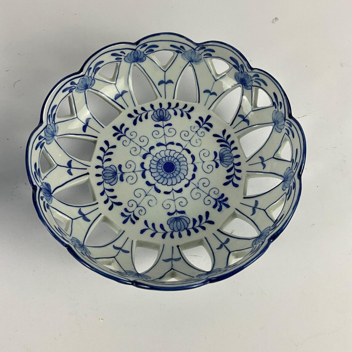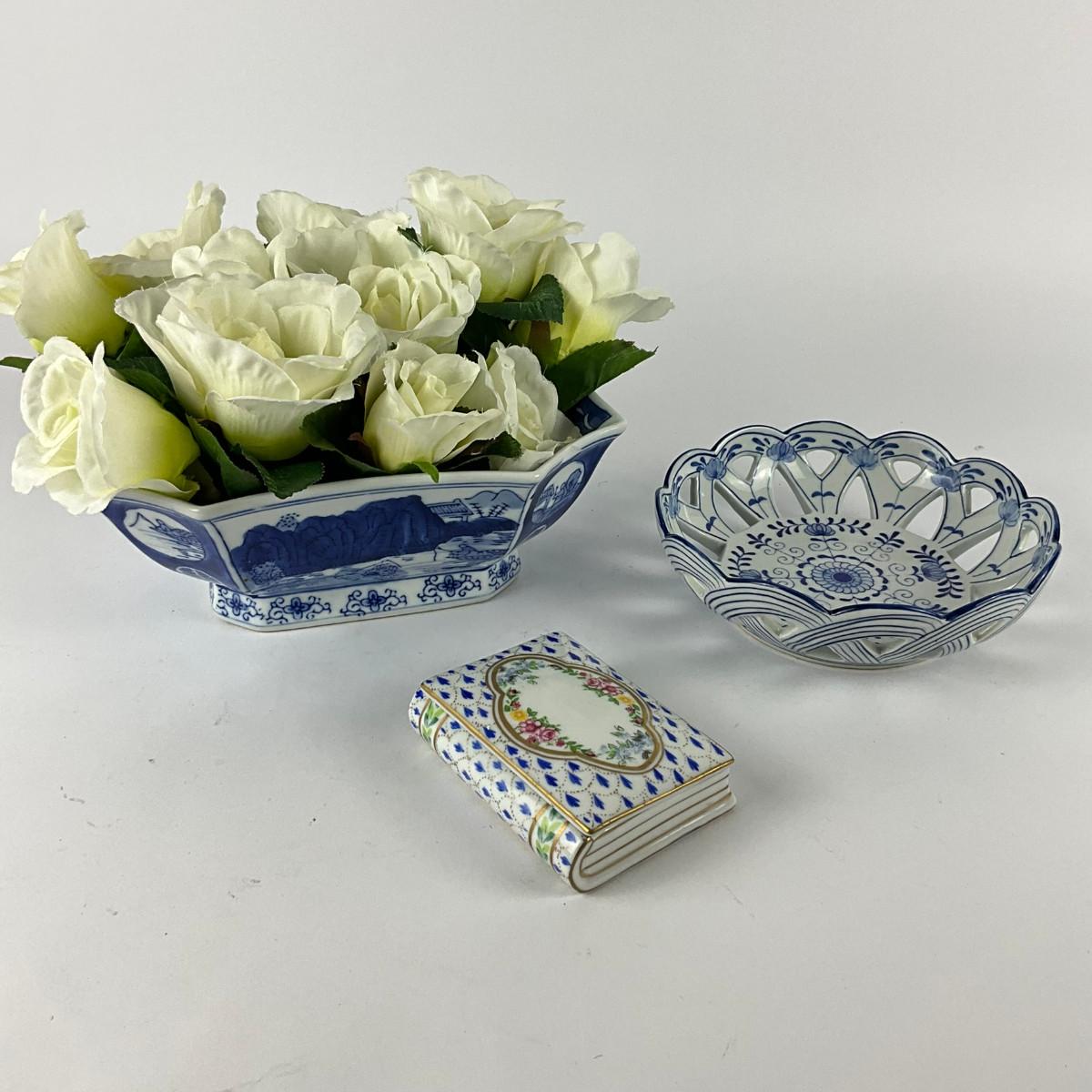 Lot includes: Porcelain Trinket Box by Paris Royal With Lid (floral design on top with trimmed gold edges), one Chinese blue & white style bowl with faux flowers and one reticulated blue & white bowl