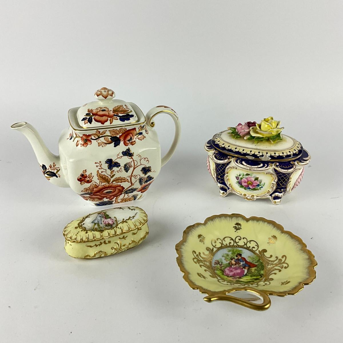 374 Enoch Wedgewood Floral Teapot With Yellow Oval Trinket Box, Leaf Tray & Rose Lid Trinket Box