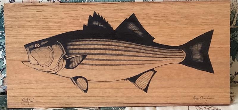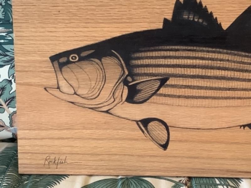 Signed Rockfish art on wood board measures 24” long and 11-1/4” high