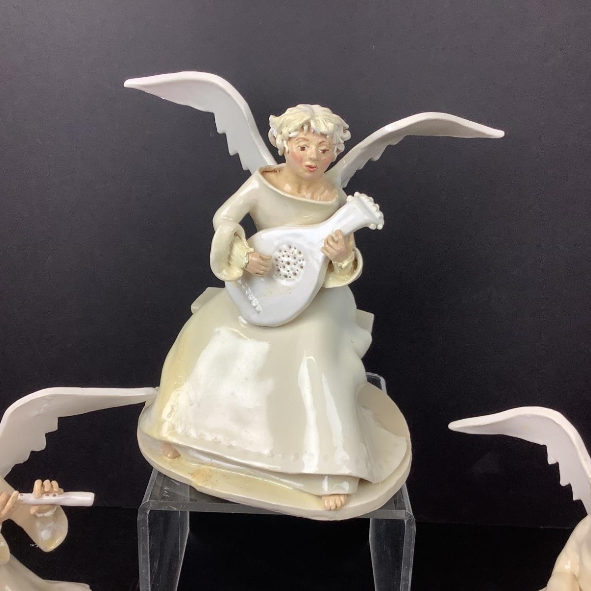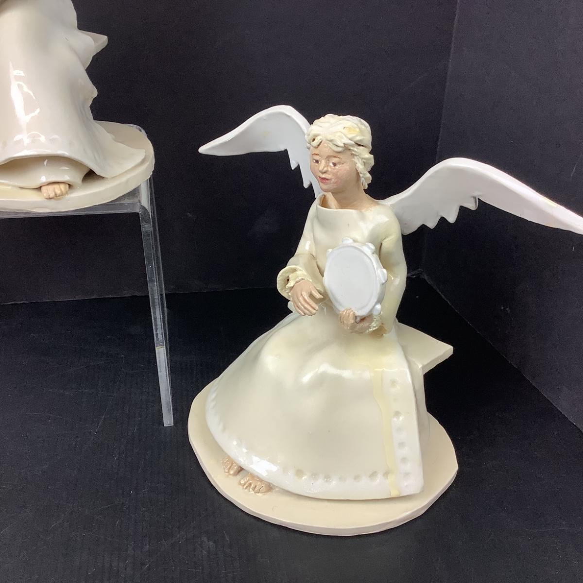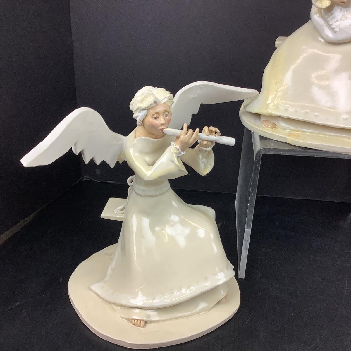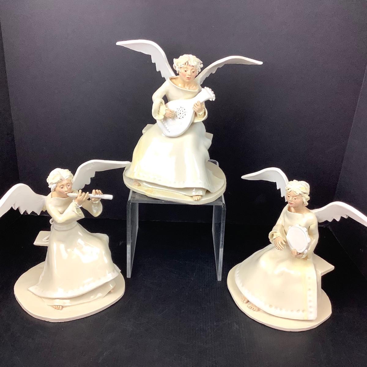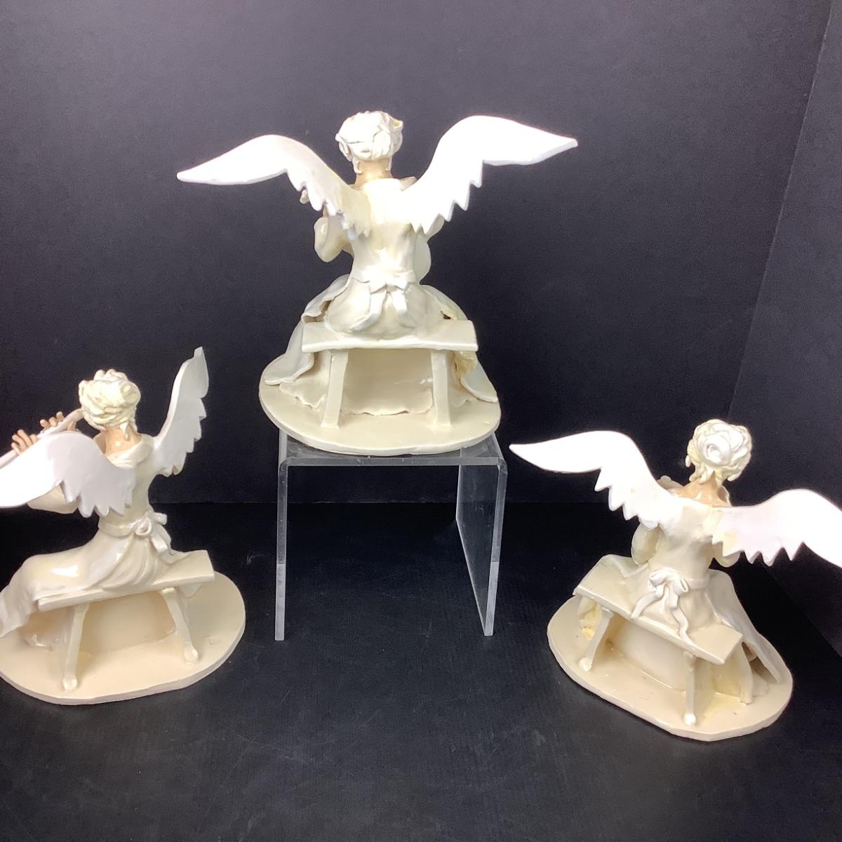 The angles are each playing a musical instrument and in the seated position, they measure 8" tall and 10" wide. Made by local artist Virginia Perram.