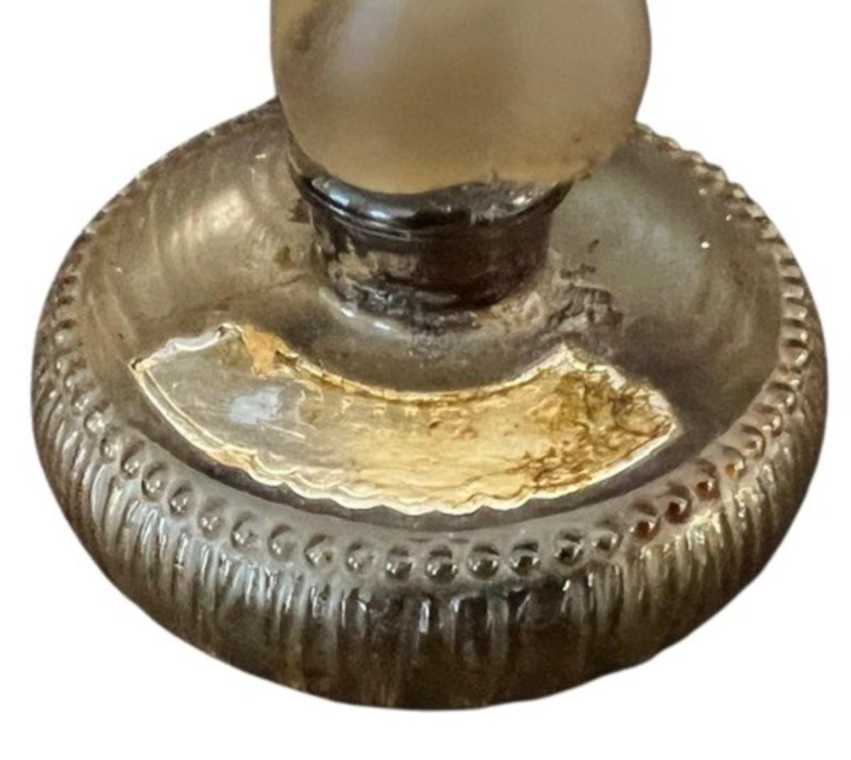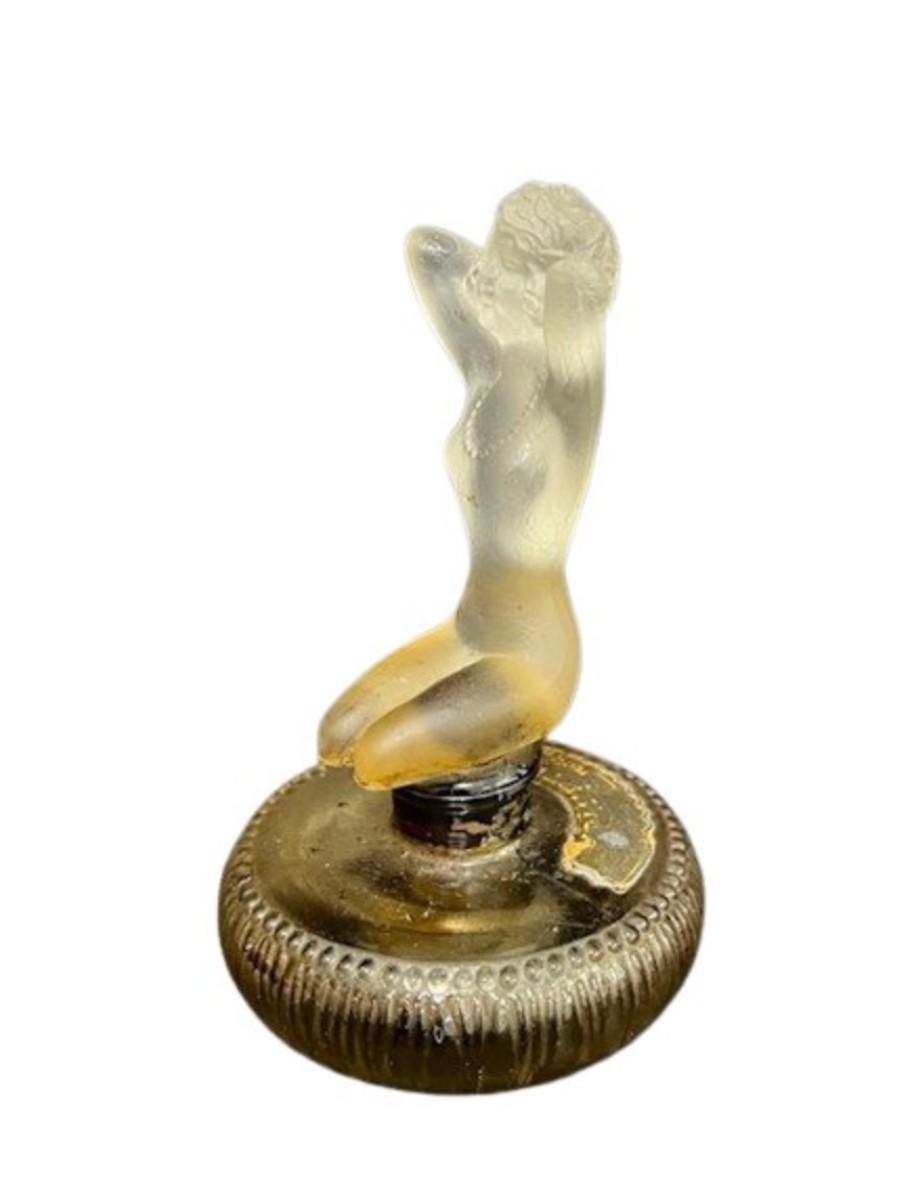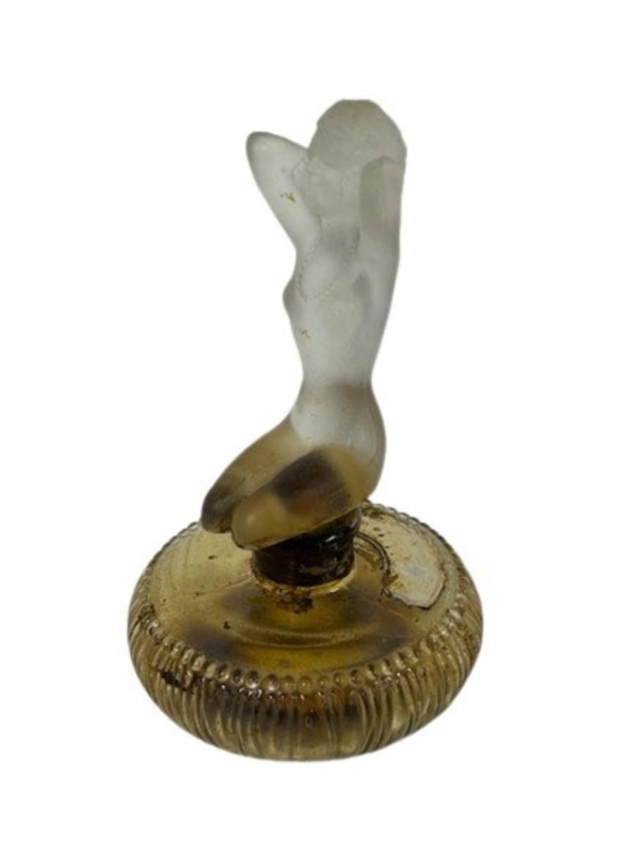 Made in France. Stopper is a nude lady. Perfume has hardened, and the stopper is stuck as a result. No obvious chips or cracks. Label is worn. Measurement: 4"H. [KA]