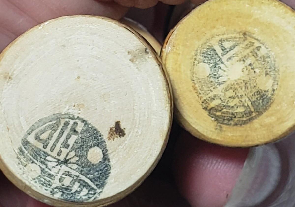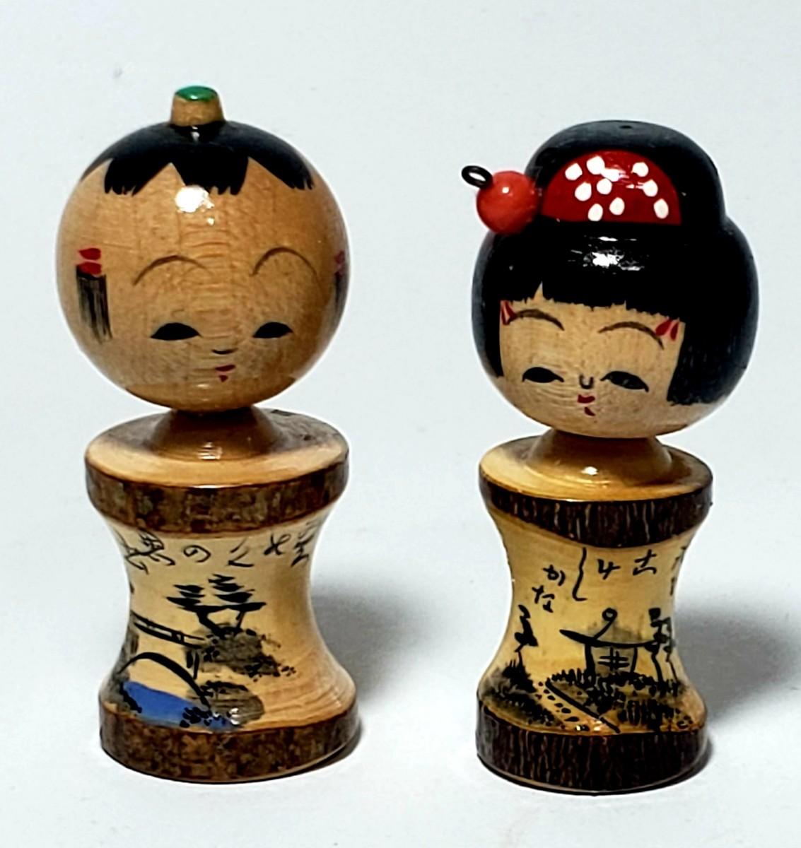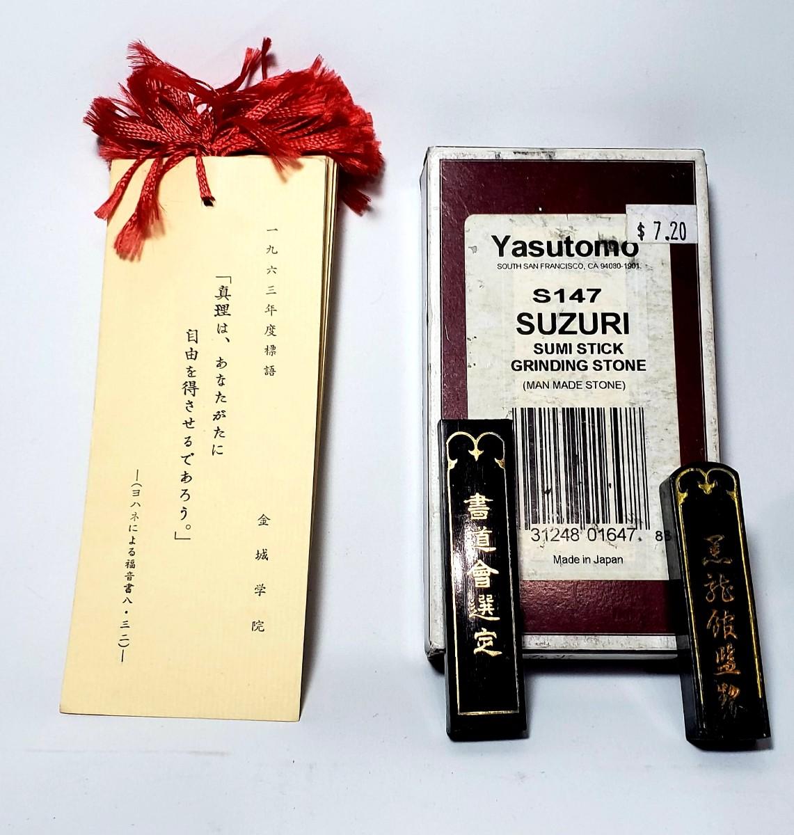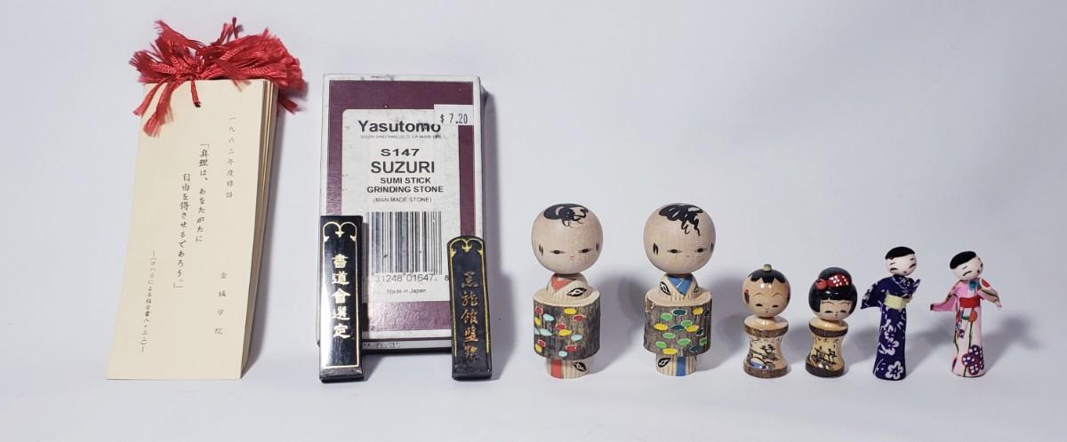 Asian lot including; Sumi sticks, Sumi stick grinding stone, antique Kokeshi dolls, and other items.
