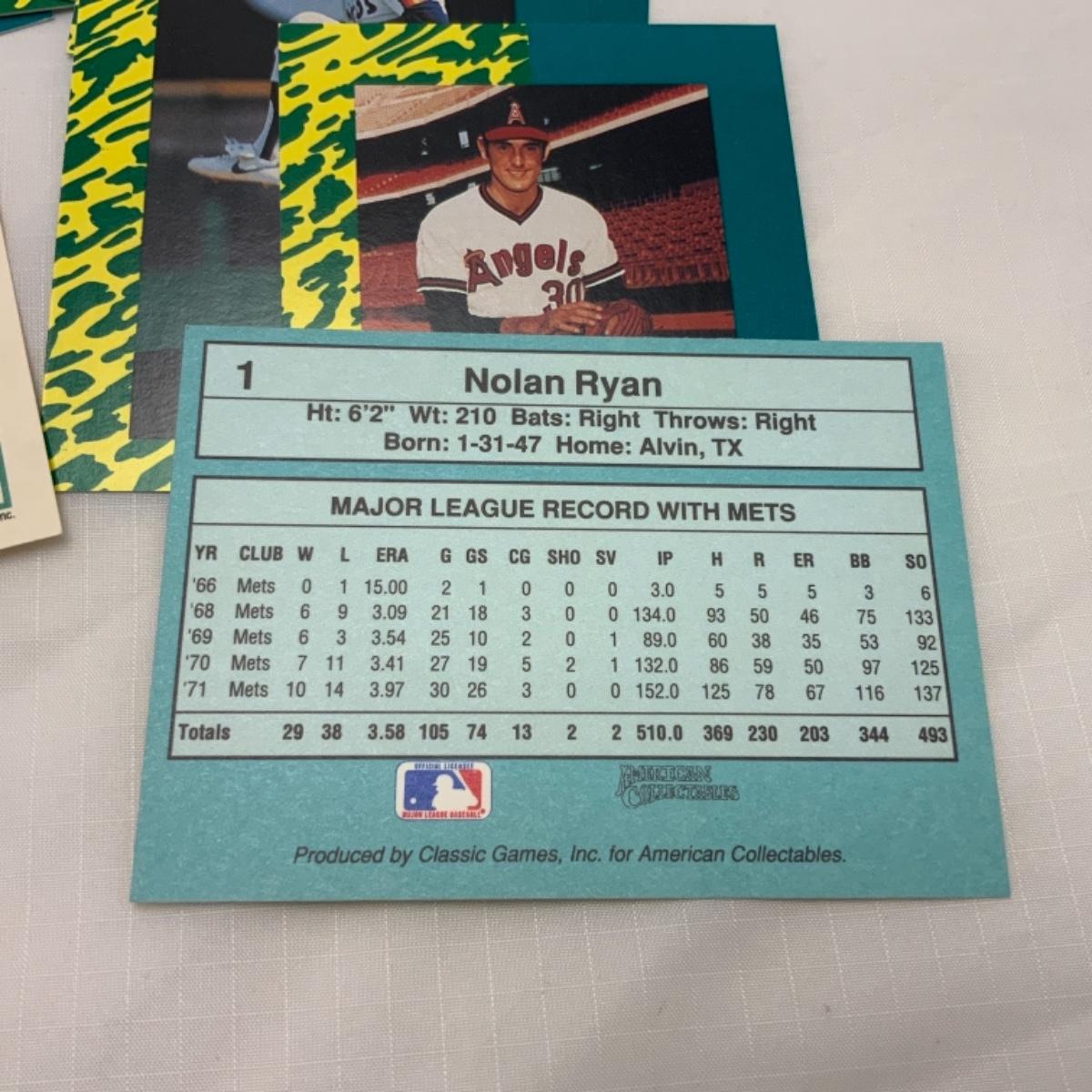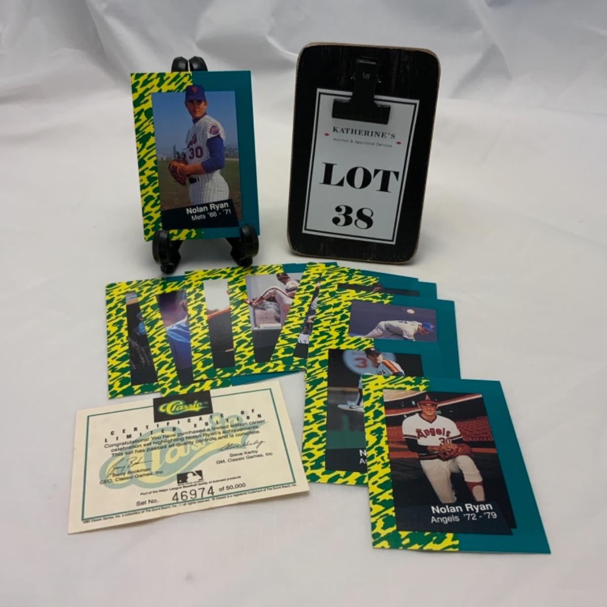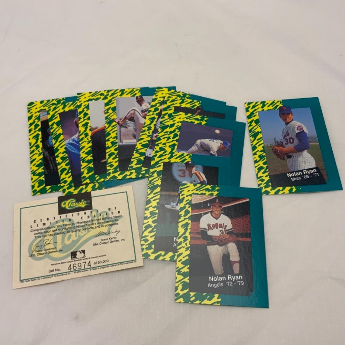 Limited Edition Classic Card Set celebrating Nolan Ryan’s Career. Set comes with certificate of authenticity and small card case to hold all cards together. Please see photos for details and condition. ::: Shipping is available on this lot. If you require shipping you must let us know at the close of the auction. We will coordinate with you after the item has been won. Shipping fees will include insurance up to or exceeding the value of all items being mailed. If you have any questions regarding this lot please contact the auctioneer either via this website, by direct email or by phone. PICK UP TIMES and other important information can be found in the TERMS and DESCRIPTION of the auction. Please take a look for pertinent information. Thanks!