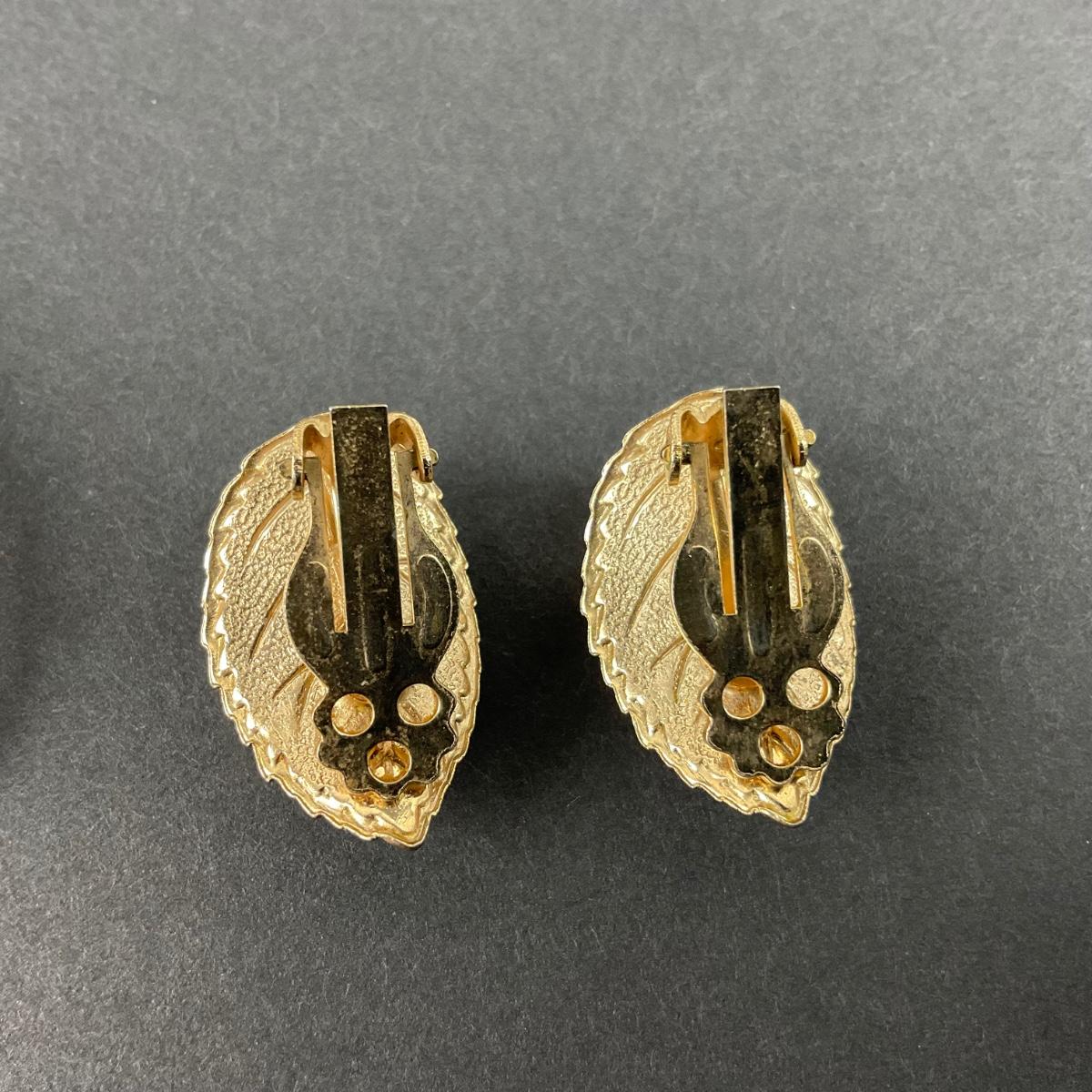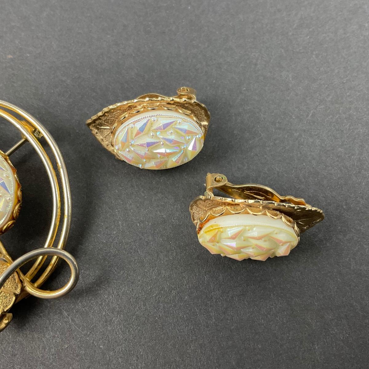 Gold tone brooch and vintage clip earrings unmarked. Please see photos for details and condition. Any condition statement is given as a courtesy to a client, is an opinion, and should not be treated as a statement of fact. Reference to condition written, oral or within a condition report shall not be regarded as a full account of condition and may not include all defects, alterations, or restorations. Absence of a condition report does not imply a lot is flawless or lacking imperfections or damage. Katherine’s Auction & Appraisal Service shall have no responsibility for any error or omission. Returns shall not be accepted on the basis of condition. ::: Shipping is available on this lot. If you require shipping you must let us know at the close of the auction. We will coordinate with you after the item has been won. Shipping fees will include insurance up to or exceeding the value of all items being mailed. If you have any questions regarding this lot please contact the auctioneer either via this website, by direct email or by phone. PICK UP TIMES and other important information can be found in the TERMS and DESCRIPTION of the auction. Please take a look for pertinent information. Thanks!