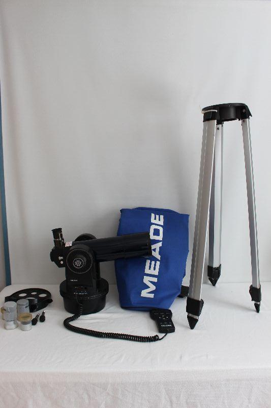 Meade Telescope w/Eyepieces Lenses w/Tripod *Note one leg of the tripod will not stay locked. The blue tripod bag strap is shredded. The telescope does require batteries. Lens F-350 5.0