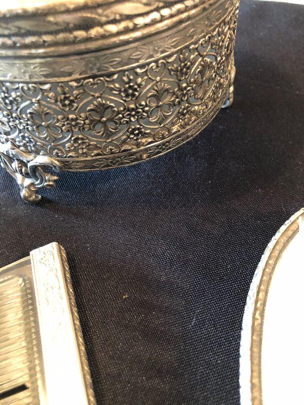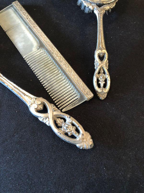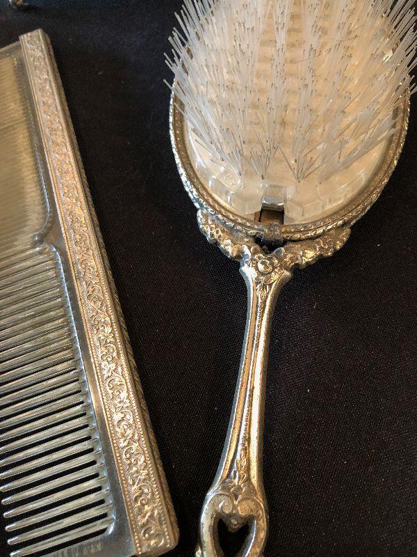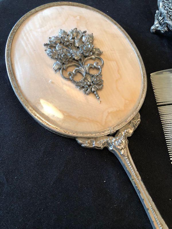 #380 Dresser Set : Hand Mirror, Jar / Powder, Comb, Brush